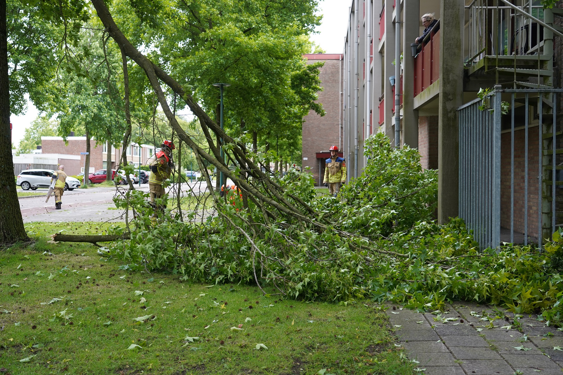 Geplaatst op 10 juni 2024, om 22:00 uurDONGEN – Tijdens de storm van maandagmiddag brak een grote tak van een boom af en belandde op de galerij van een flat.