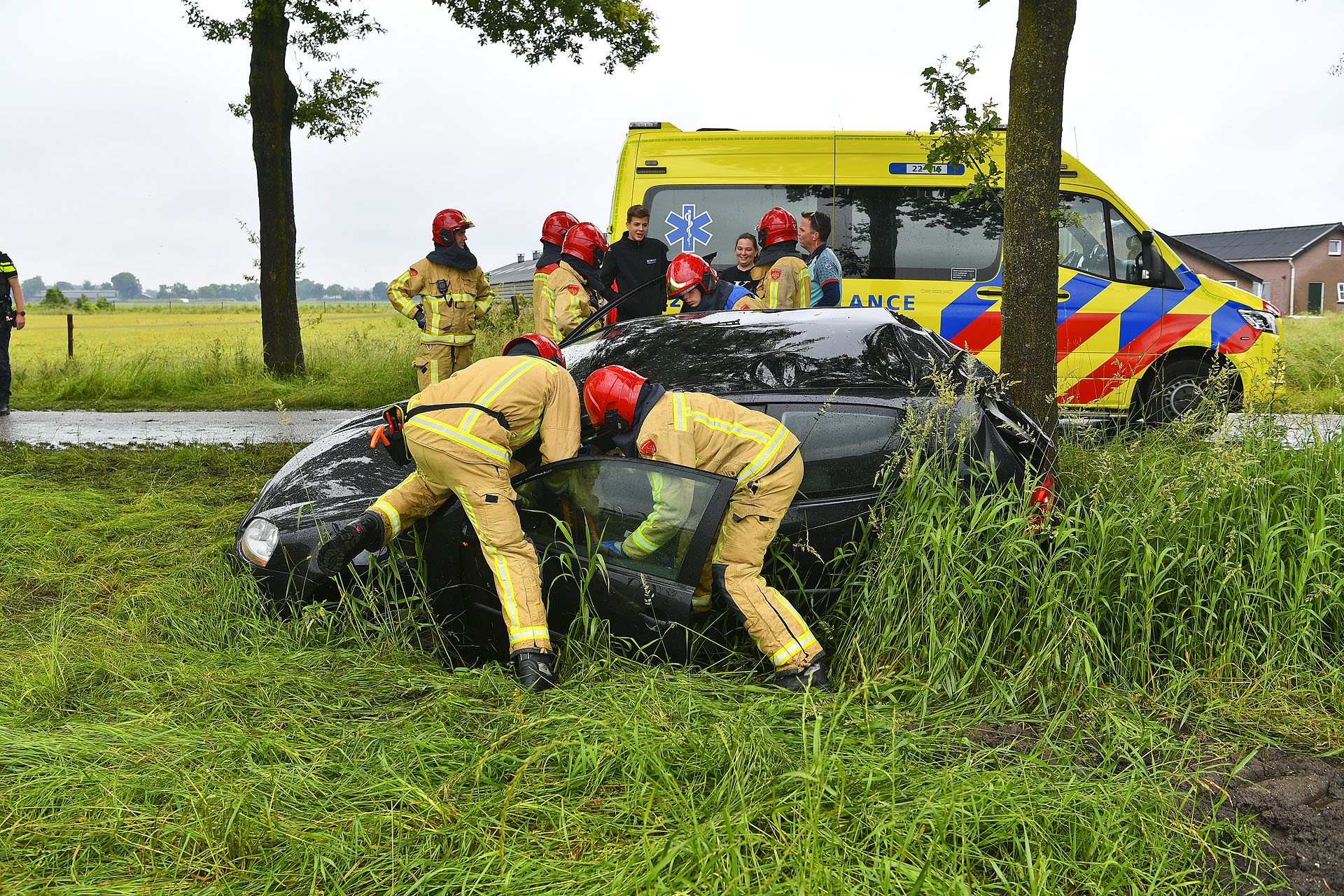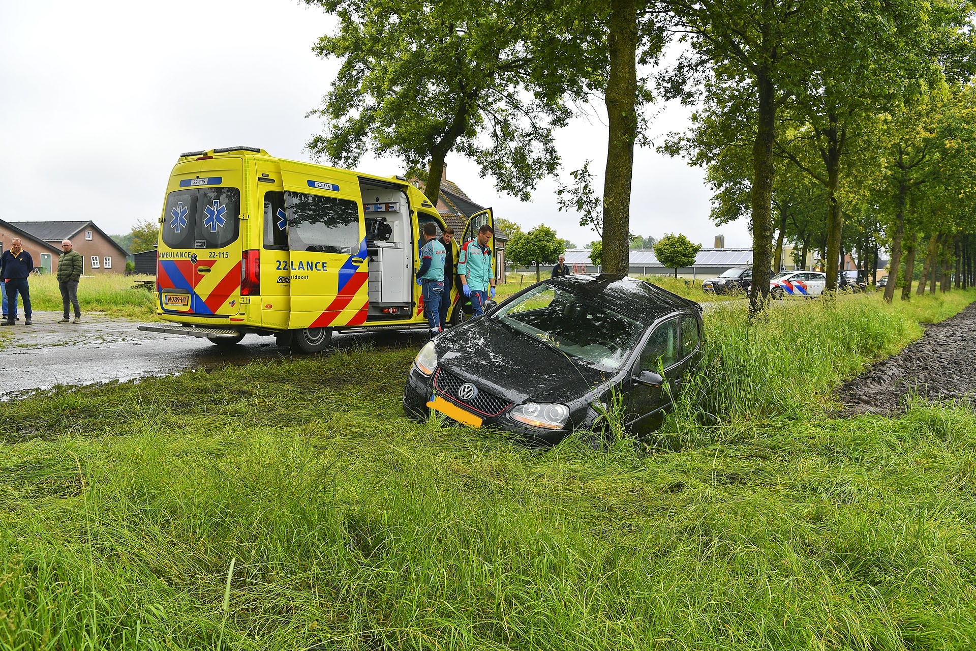 De auto raakte in een slip en kwam achteruit tot stilstand tegen een boom. Beide inzittenden konden zelfstandig uit het voertuig komen. Eén persoon werd ter plekke nagekeken in de ambulance, maar hoefde niet mee naar het ziekenhuis. De ander bleef ongedeerd, hoewel hij zich niets van het ongeval kon herinneren.