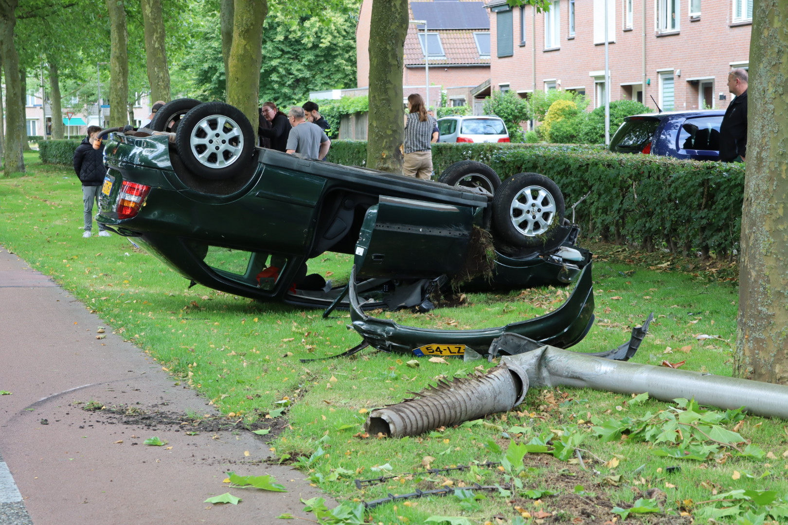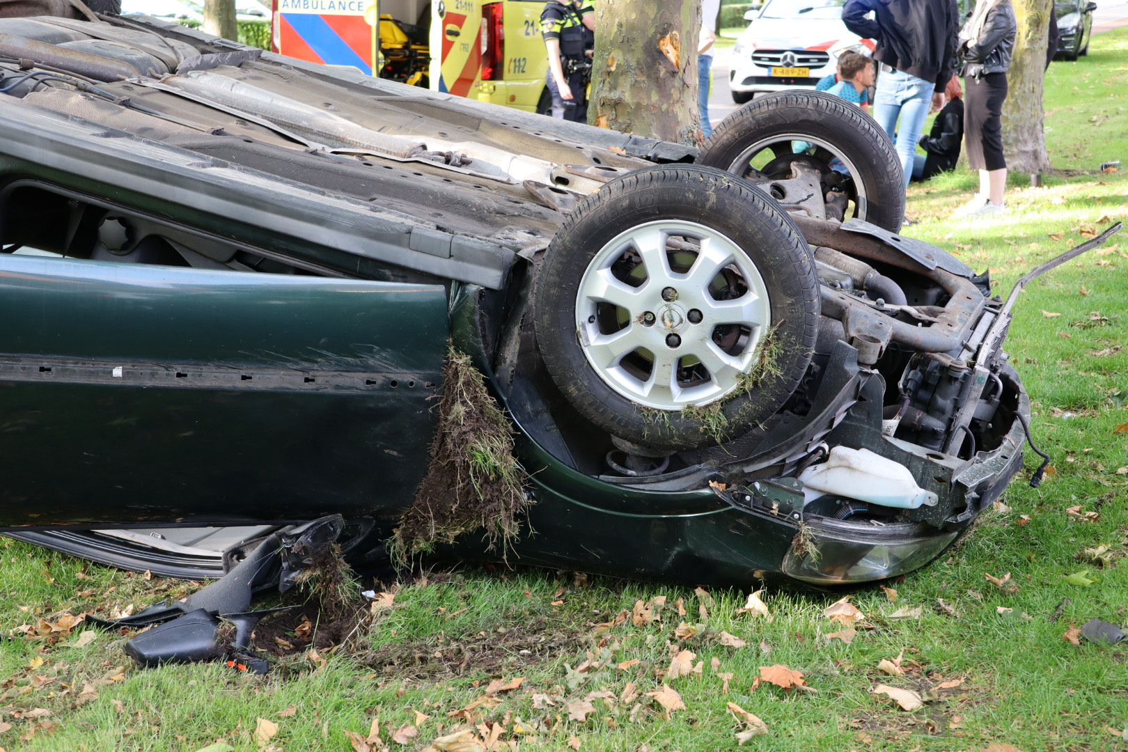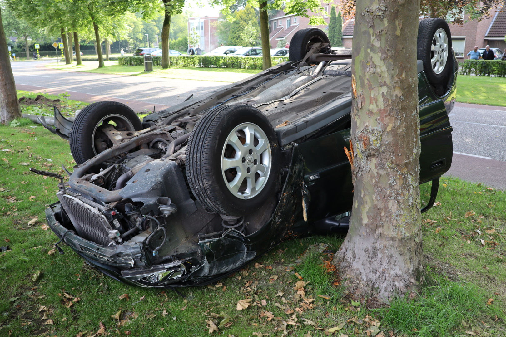 Door een onbekende oorzaak verloor een bestuurder de controle over het stuur, ramde een lantaarnpaal en kwam vervolgens op zijn kop tot stilstand tegen een boom. In de auto zaten een jongen en een meisje. Het meisje raakte gewond en moest ter plaatse behandeld worden. De schade is aanzienlijk: de lantaarnpaal is compleet uit de grond gekomen.