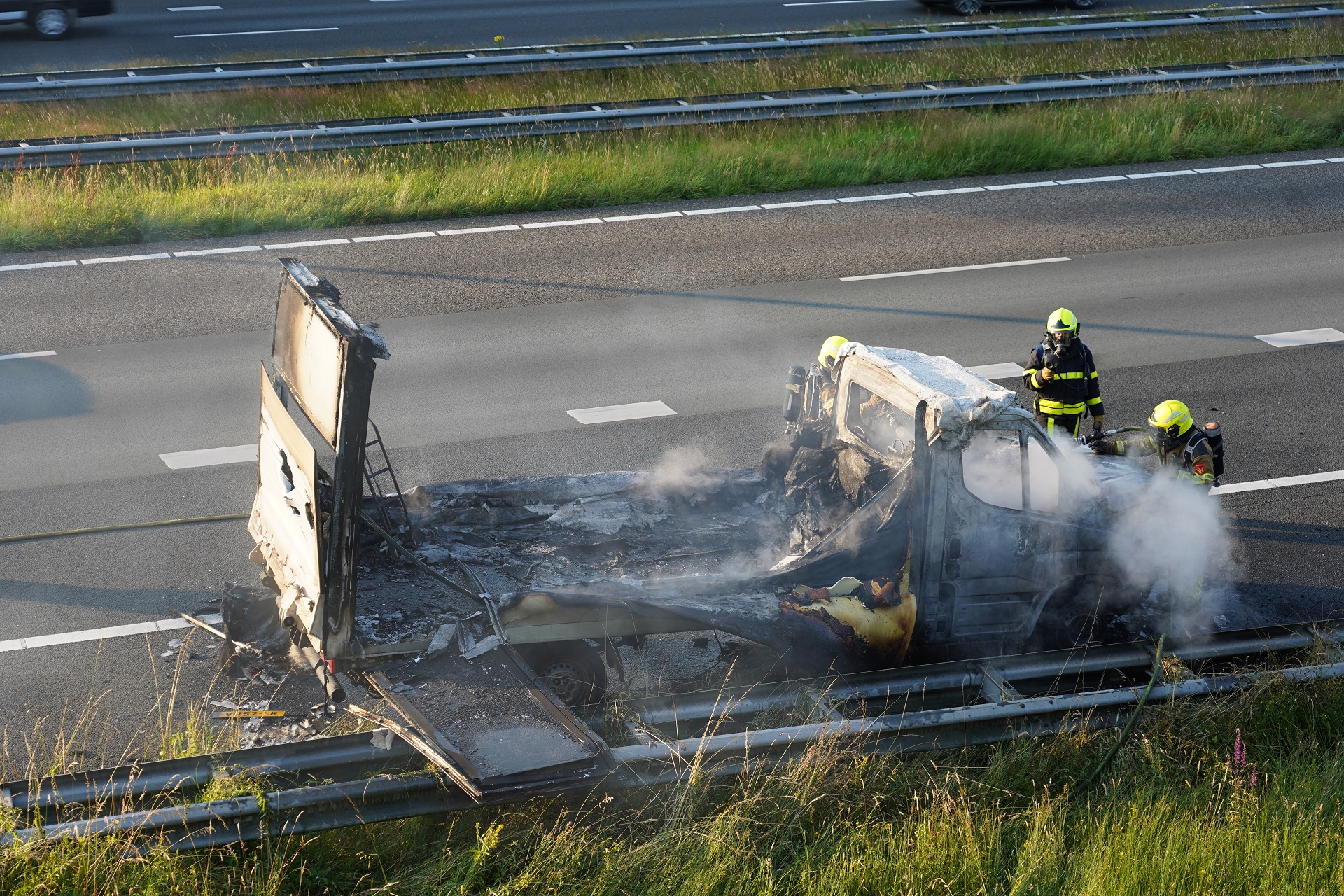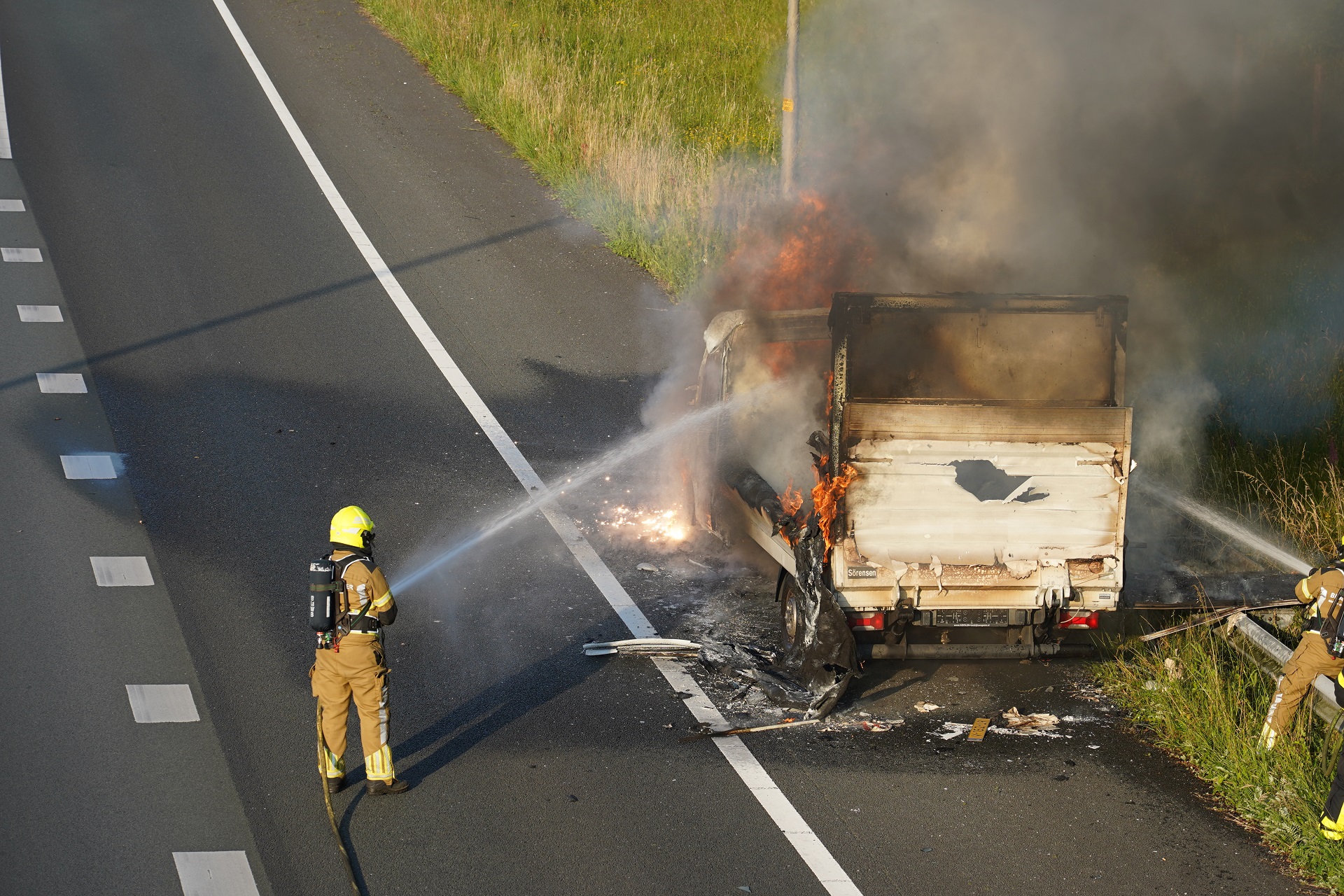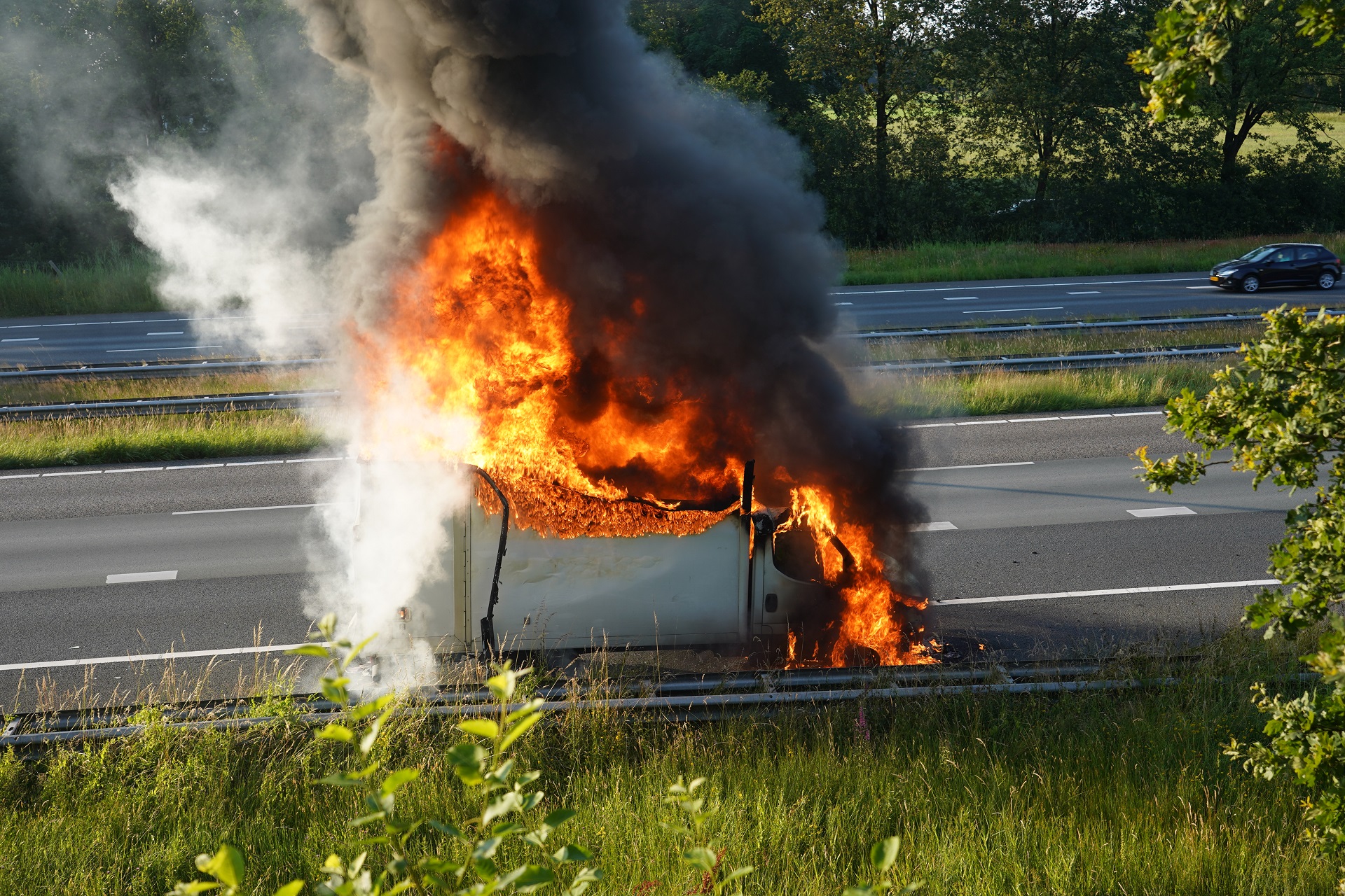 Bakwagen vliegt in brand op snelweg, bestuurder met schrik vrij