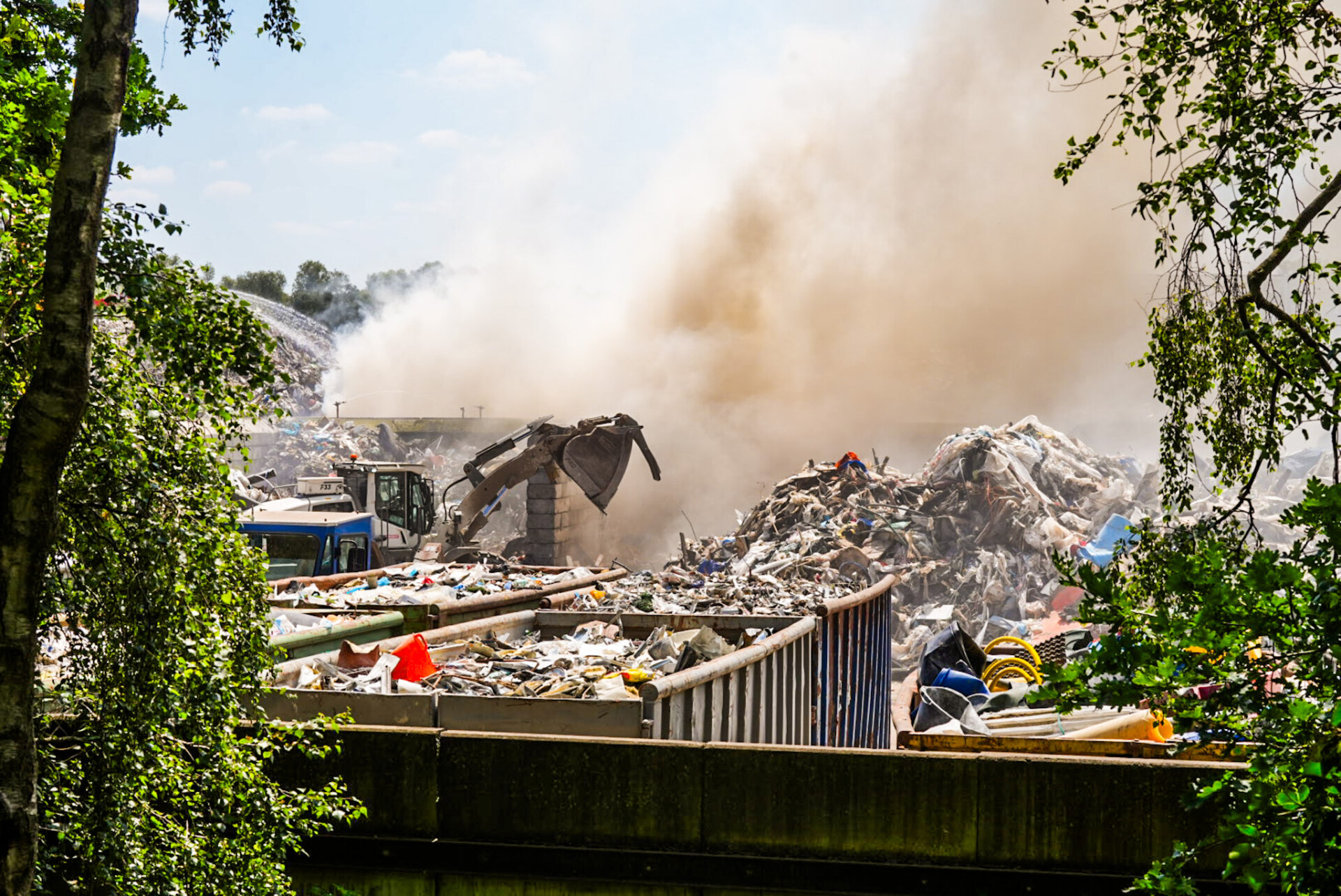 De rook van de brandende afvalberg trekt richting Best. Om uitbreiding te voorkomen, zijn meerdere brandweerwagens ingezet.
