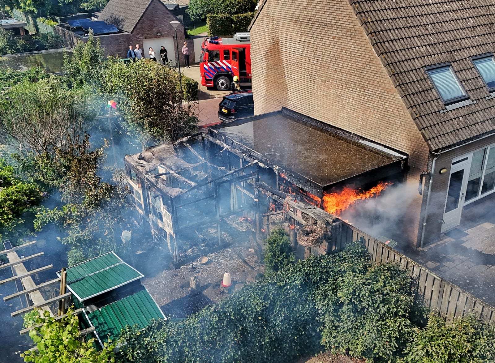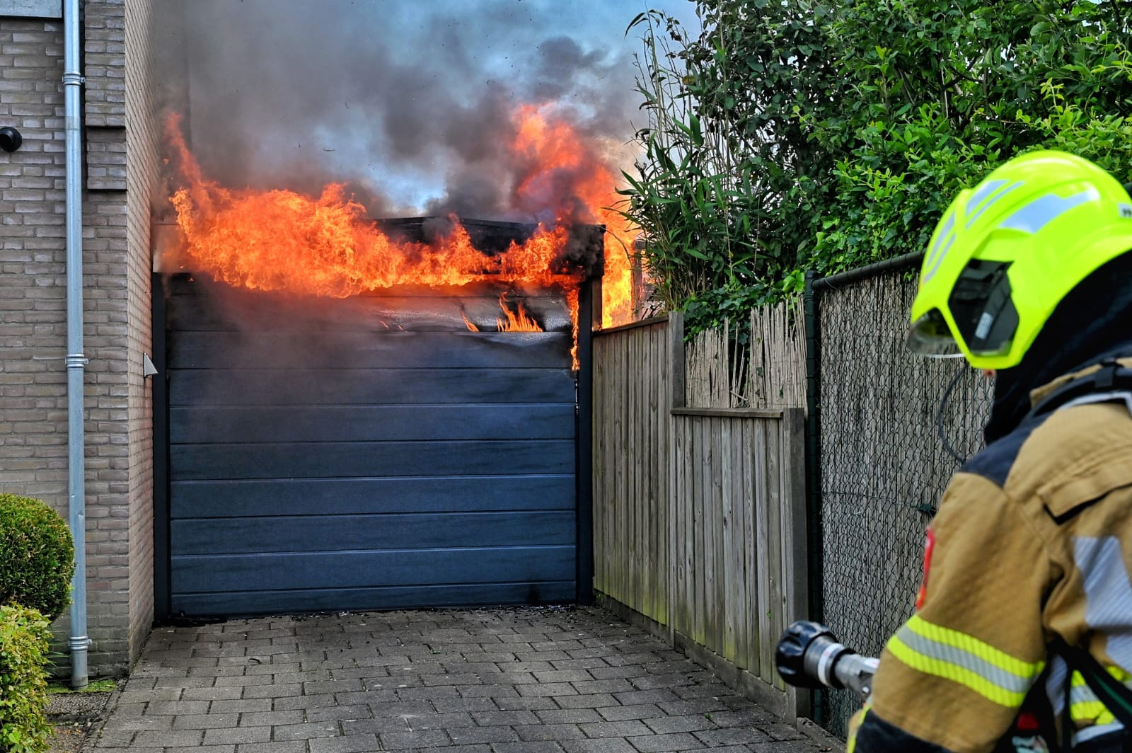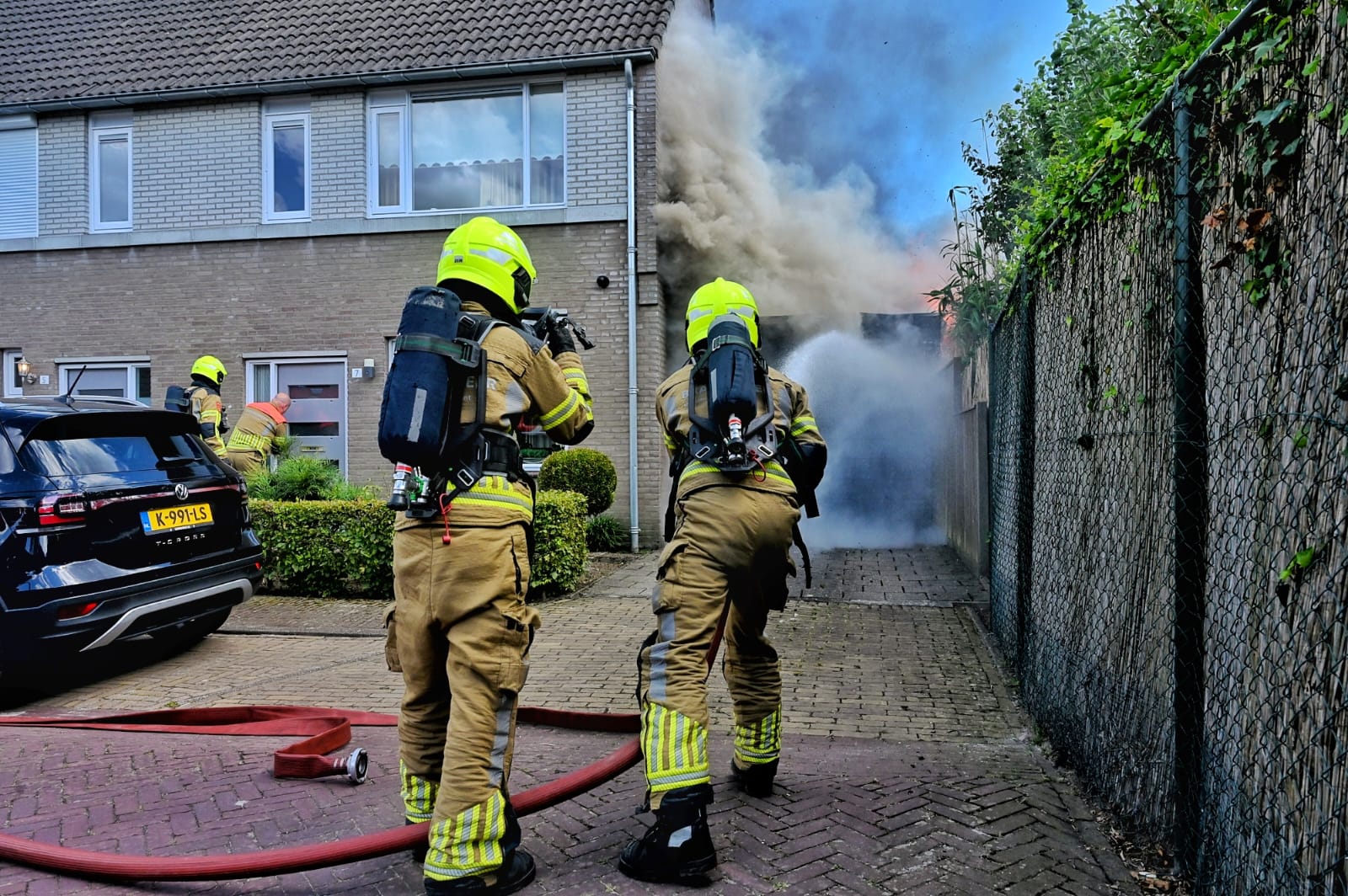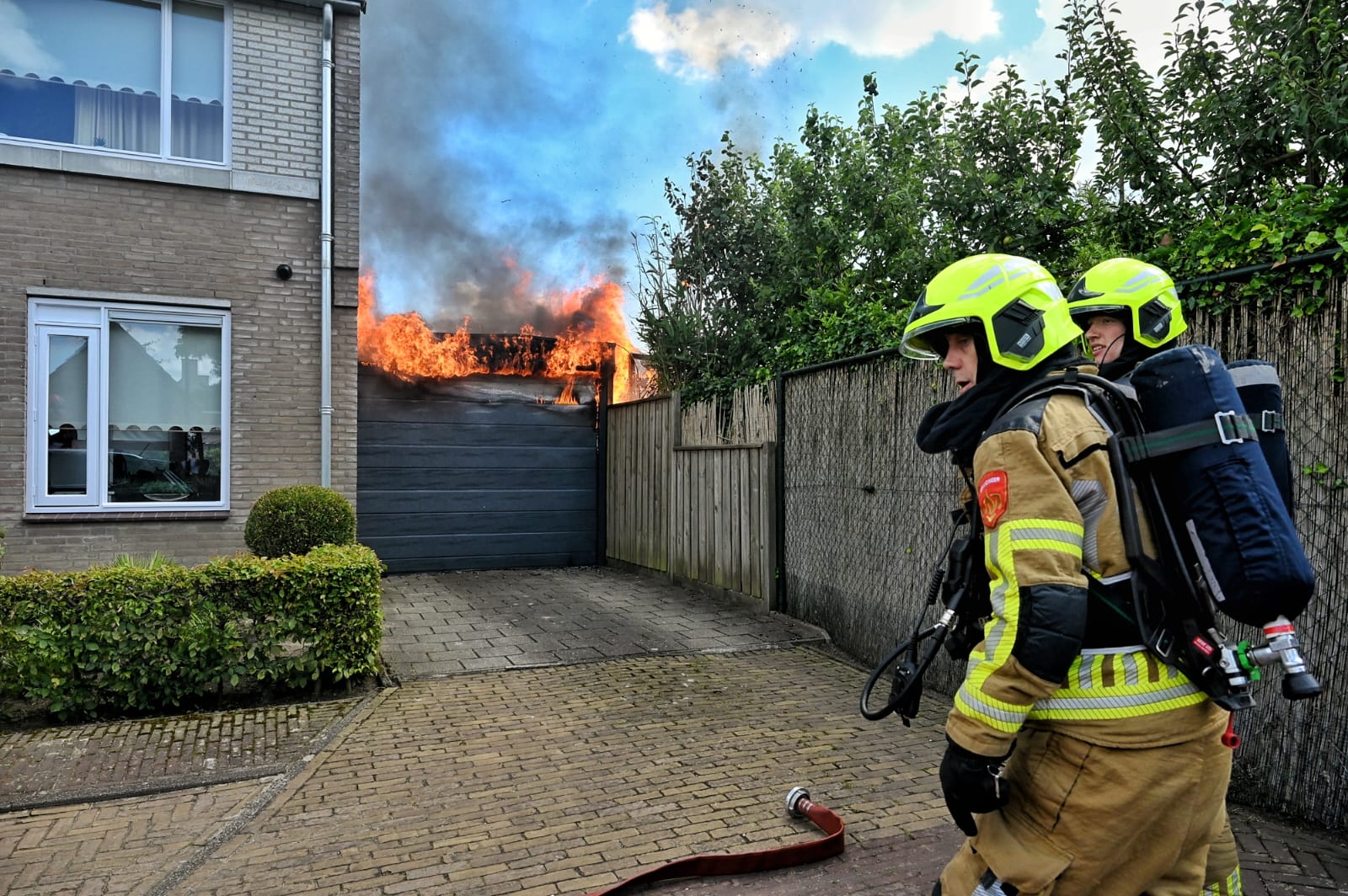 De brandweer schaalde op naar ‘grote brand’. Bij aankomst van de brandweer sloegen de vlammen al uit de garage. Ook een houten aanbouw ging in vlammen op.