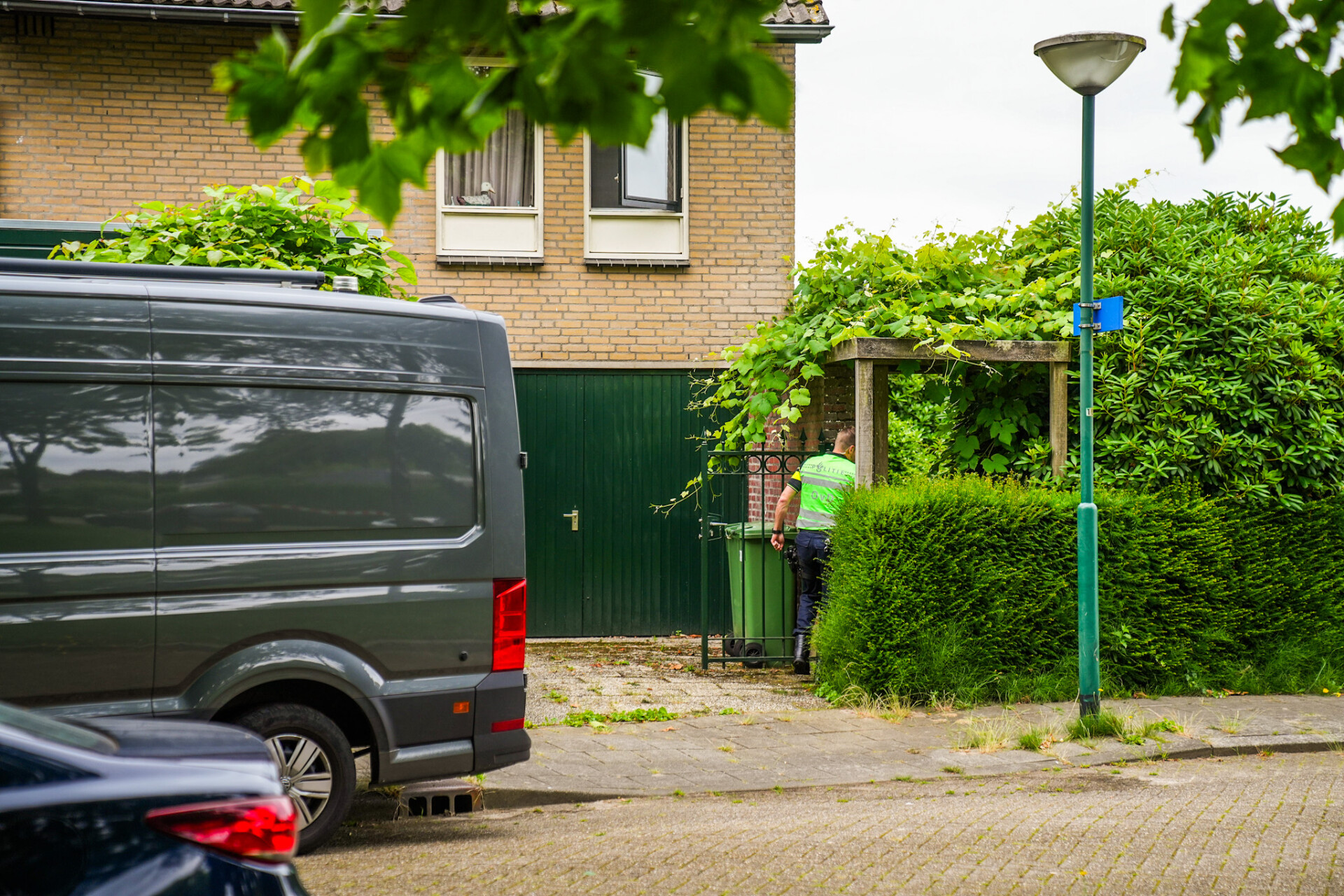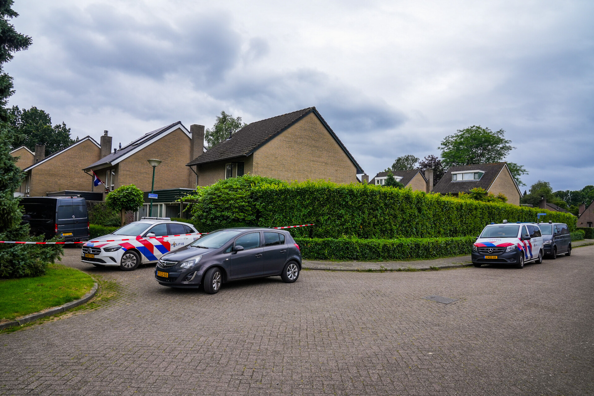 Meerdere politiewagens staan opgesteld bij een woning en het gebied rondom het huis is ruim afgezet om sporen veilig te stellen en nader onderzoek te kunnen verrichten.