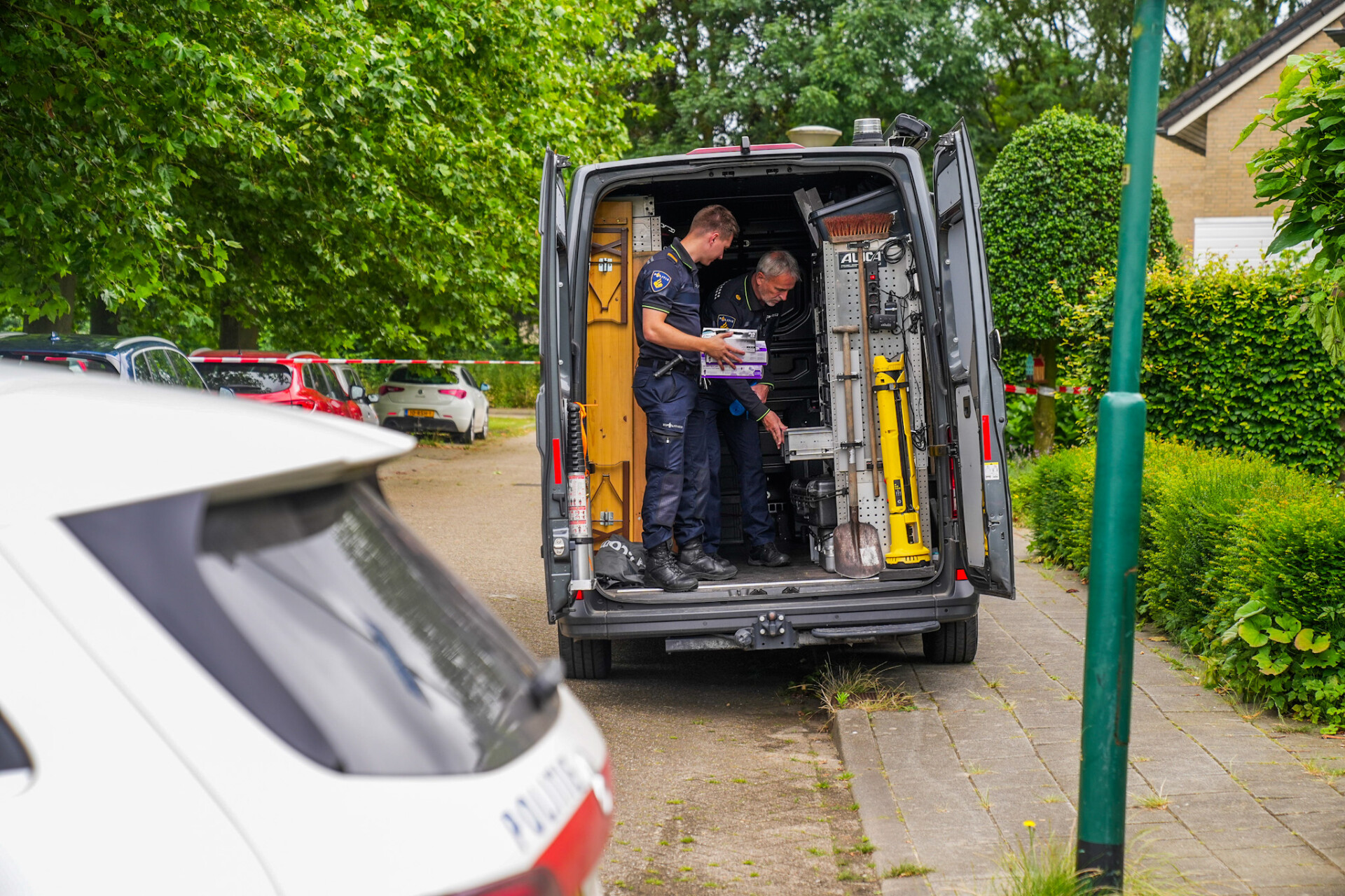Meerdere politiewagens staan opgesteld bij een woning en het gebied rondom het huis is ruim afgezet om sporen veilig te stellen en nader onderzoek te kunnen verrichten.