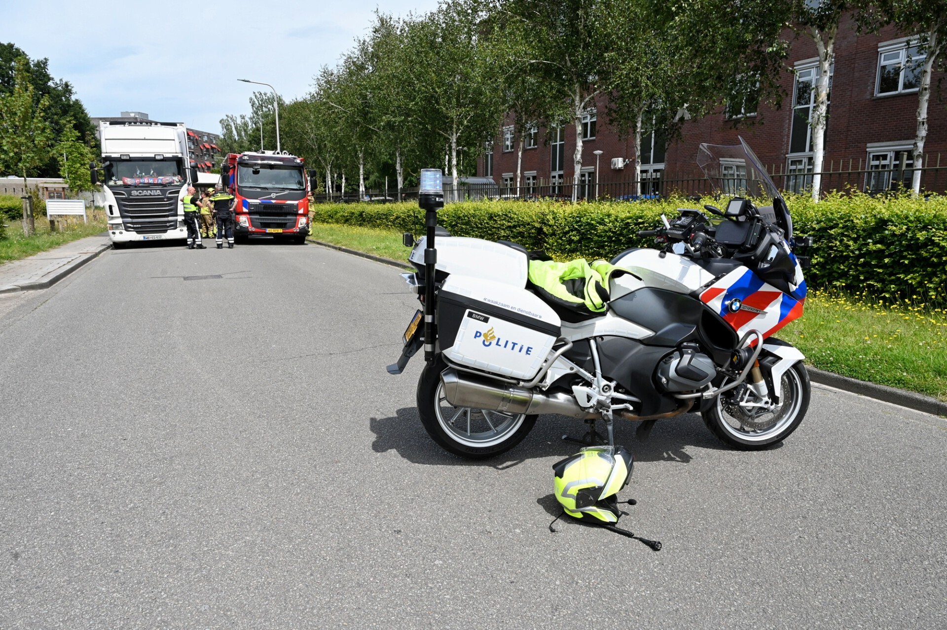 De brandweer kon voorkomen dat de trailer vlam vatte. Een berger komt ter plaatse voor de vrachtwagen.