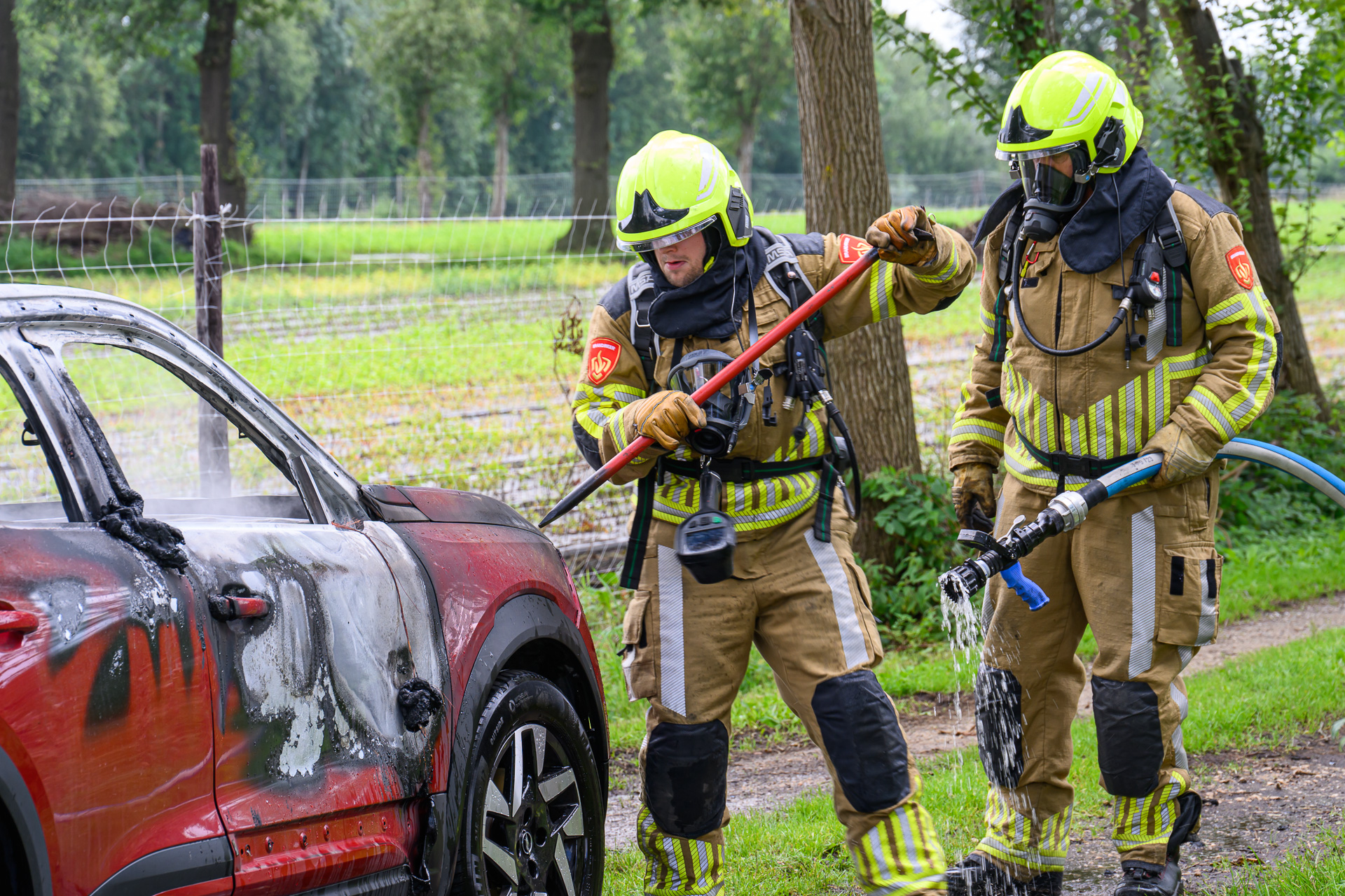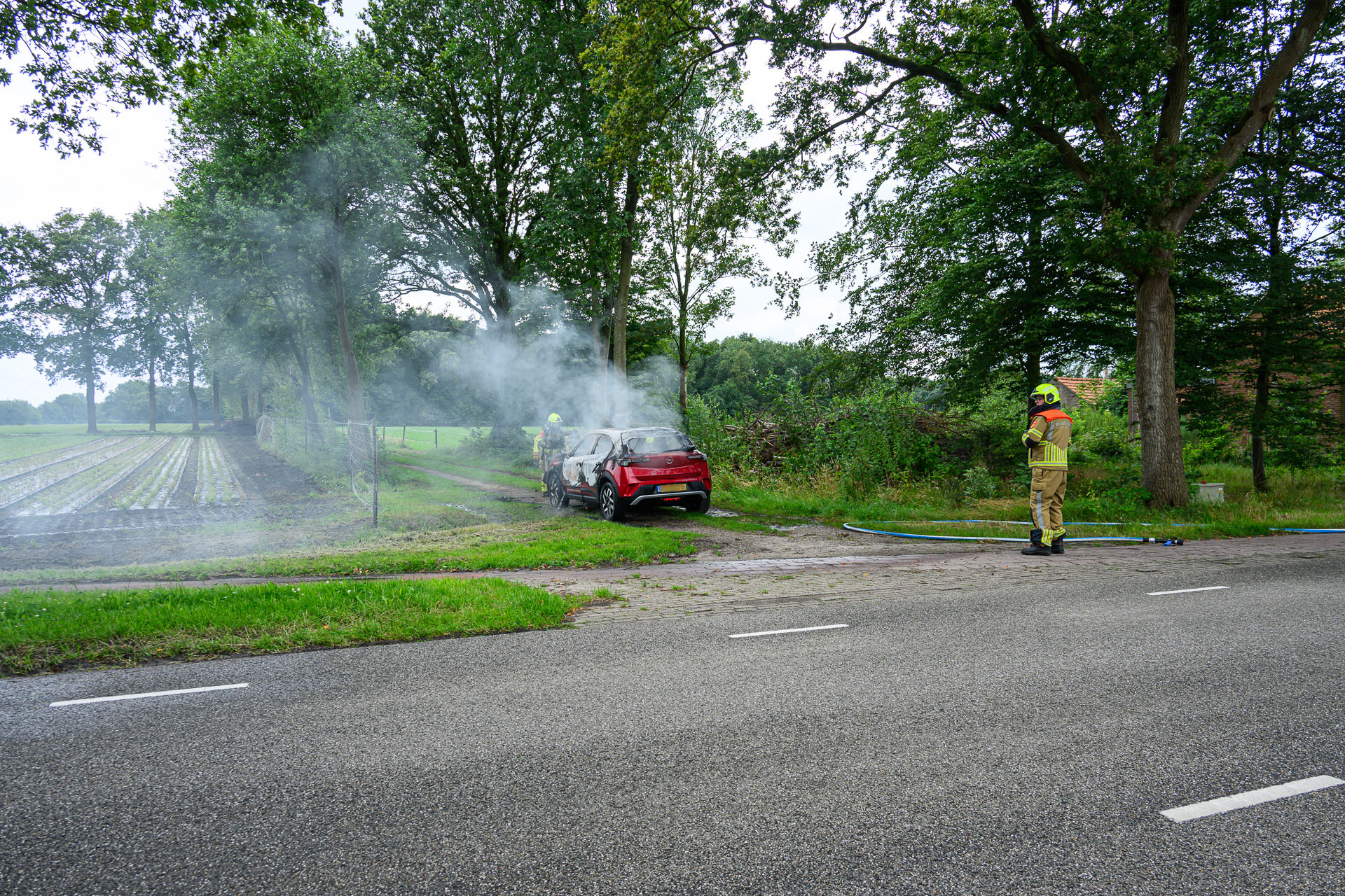 Het vuur is geblust door de toegesnelde brandweer. De oorzaak van de brand is nog onduidelijk. De auto zal worden getakeld door een bergingsbedrijf, die de auto in een speciale bak zal meenemen.