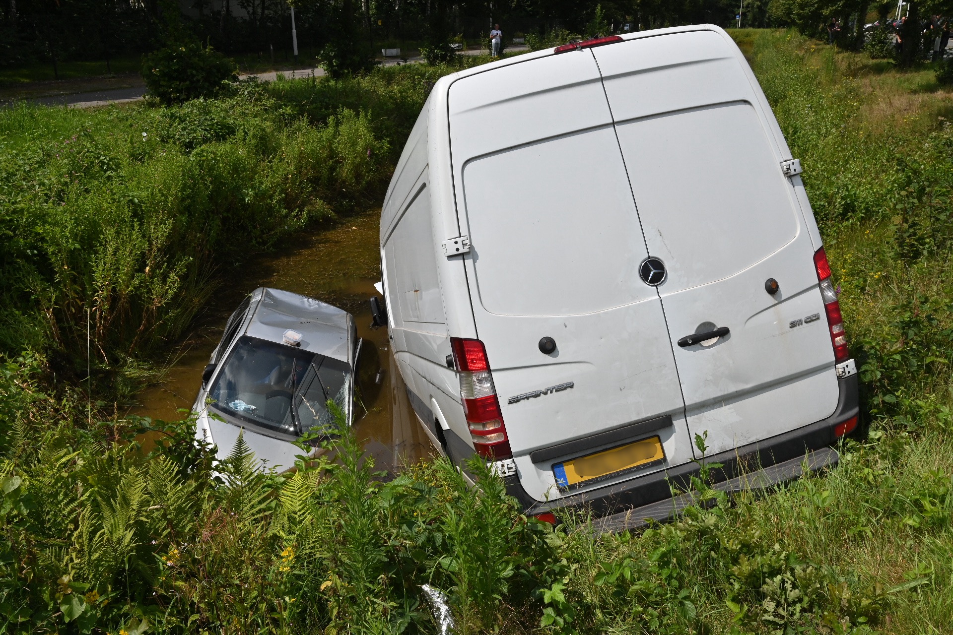 De bergingsdienst werd ingeschakeld om zowel het busje als de auto uit het water te takelen.