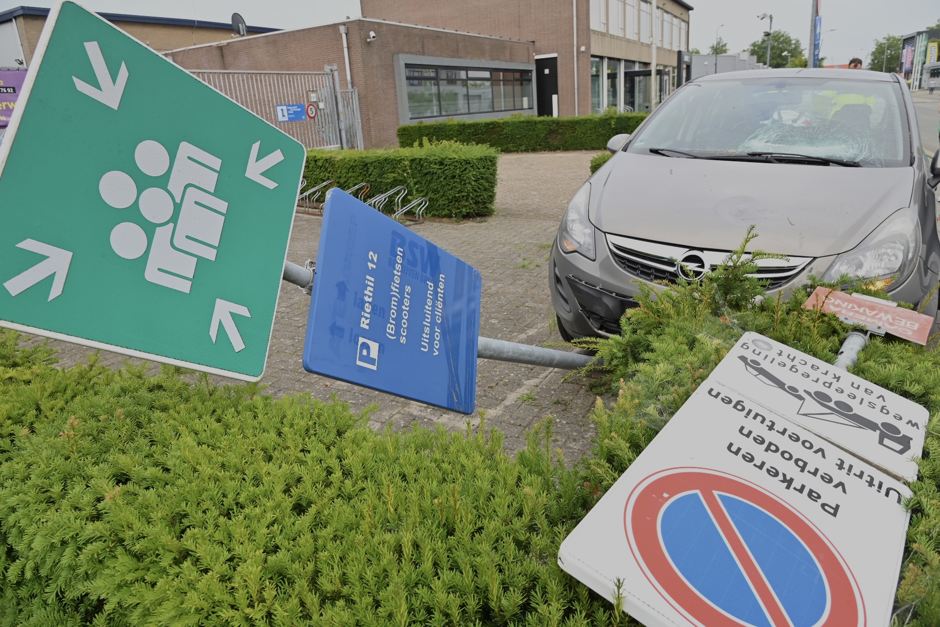 Automobiliste ramt verkeersborden en belandt op fietsenrek