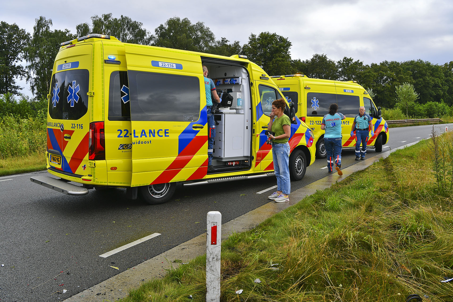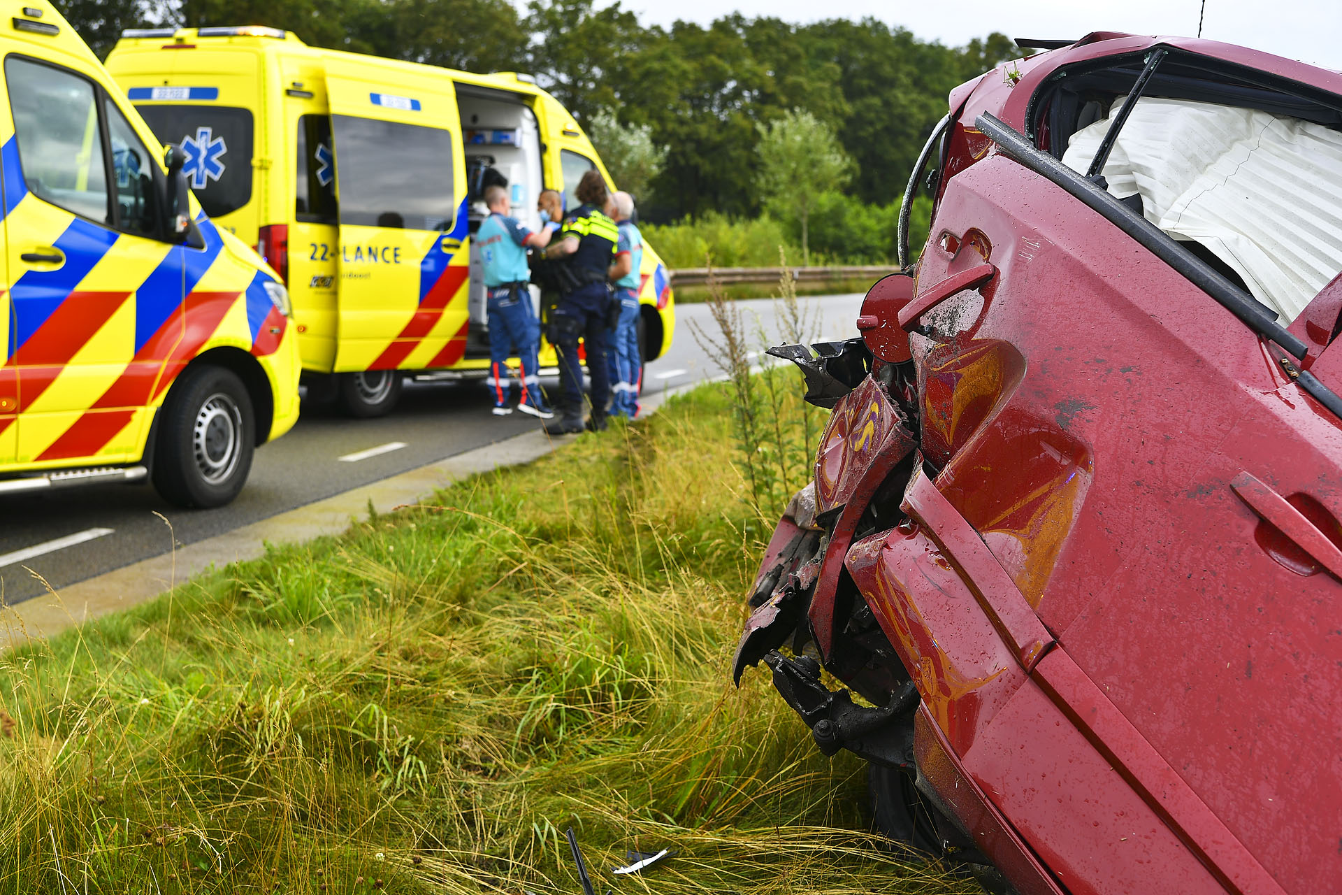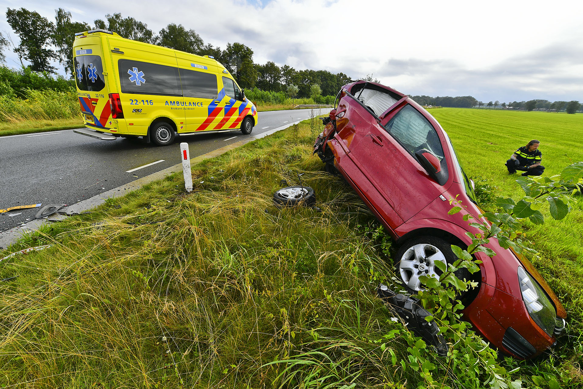 De botsing veroorzaakte een enorme ravage: een van de auto’s belandde in de sloot en brokstukken lagen verspreid over de weg. Beide inzittenden zijn met de ambulance naar het ziekenhuis gebracht. De voertuigen moesten worden weggesleept.