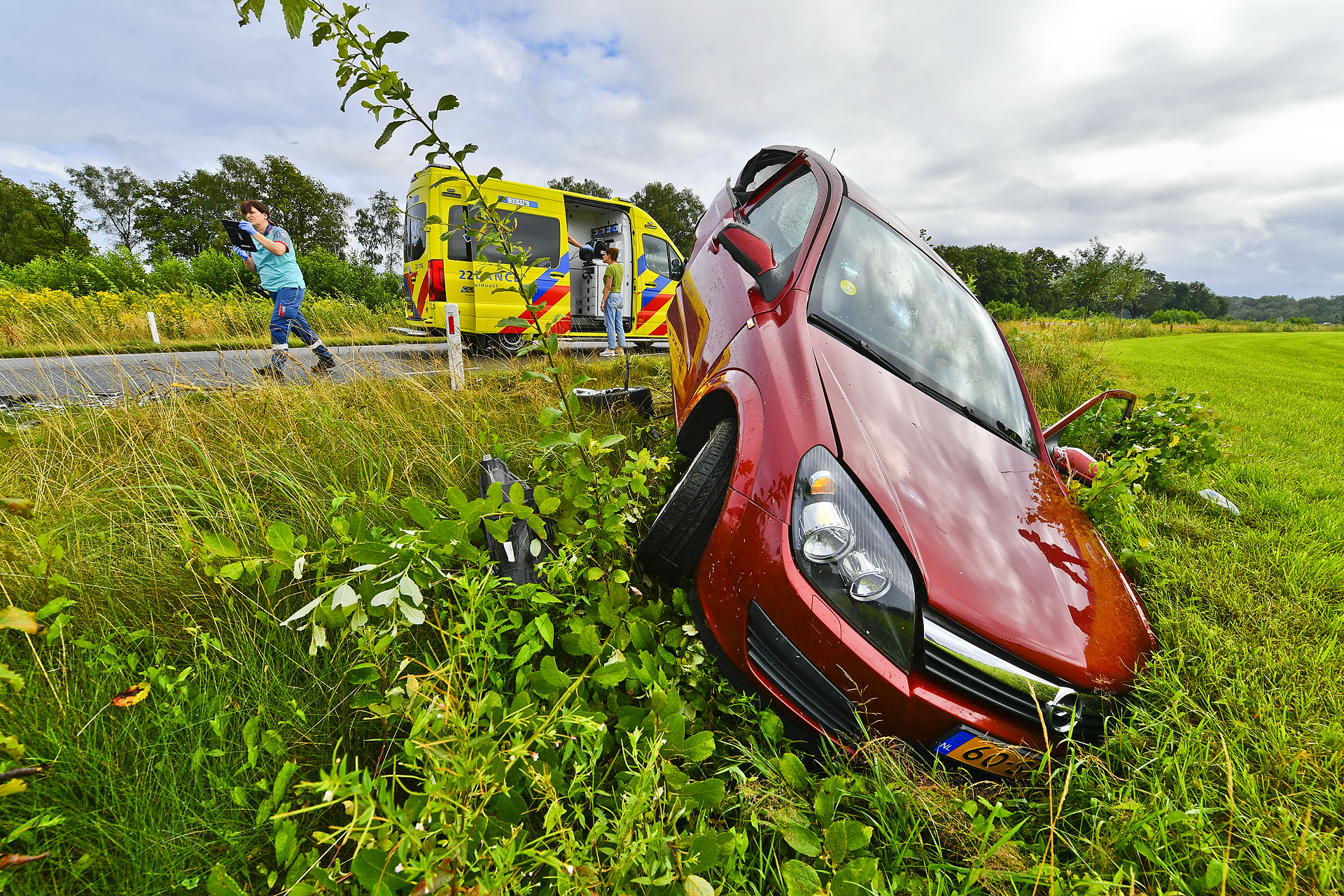 Auto belandt in sloot na botsing met busje; meerdere gewonden