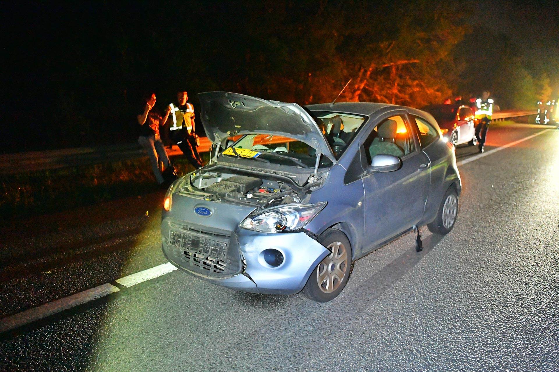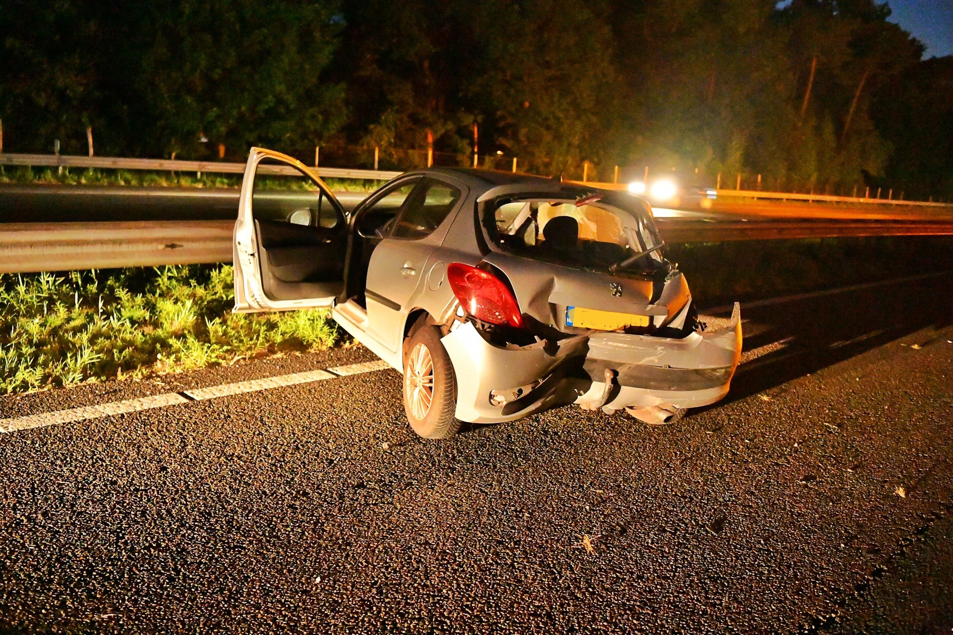 Een auto met een vermoedelijke klapband belandde in de linker vangrail en werd daarna aangereden door achterop komend verkeer. De weg is afgesloten voor alle verkeer. De brandweer veegde met man en macht het wegdek schoon. Eén inzittende is met lichte verwondingen nagekeken in de ambulance.