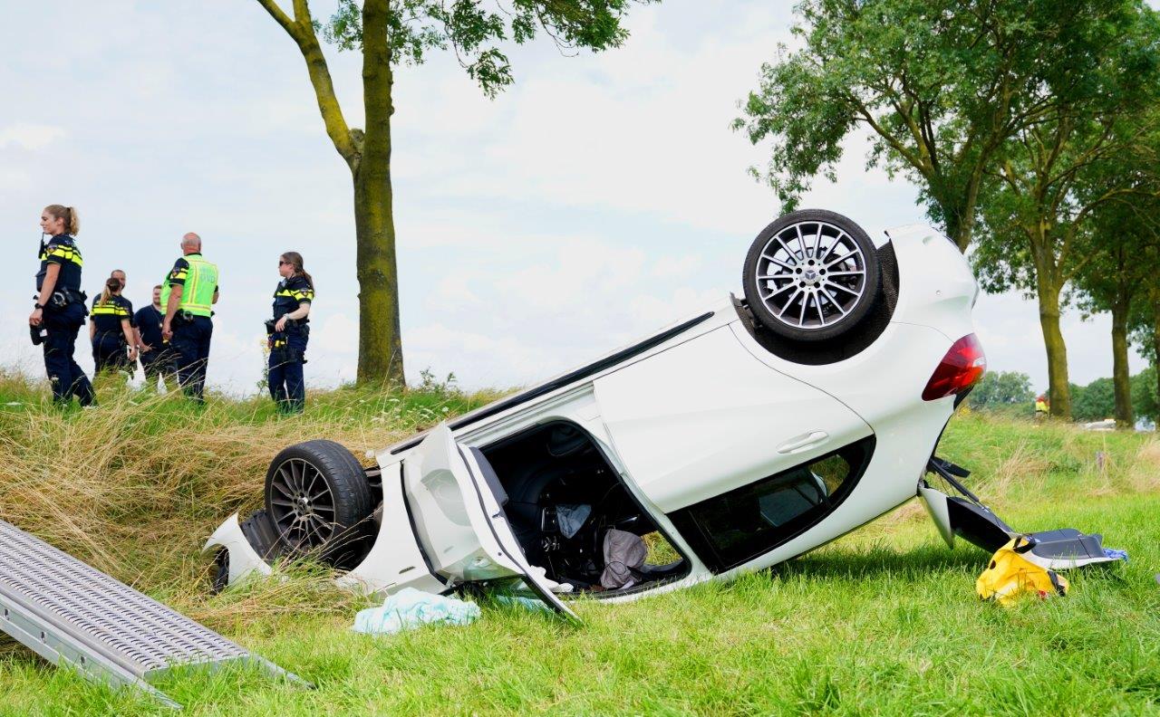 Auto ramt boom en belandt in weiland, vrouw gewond