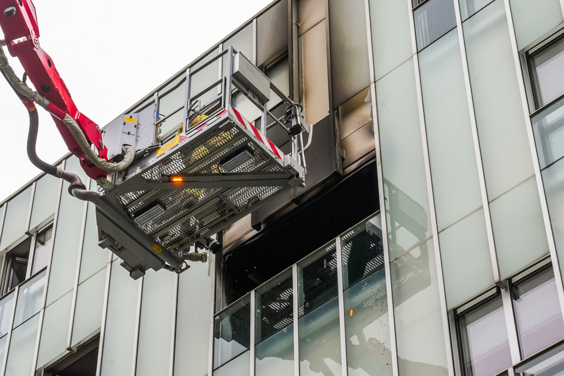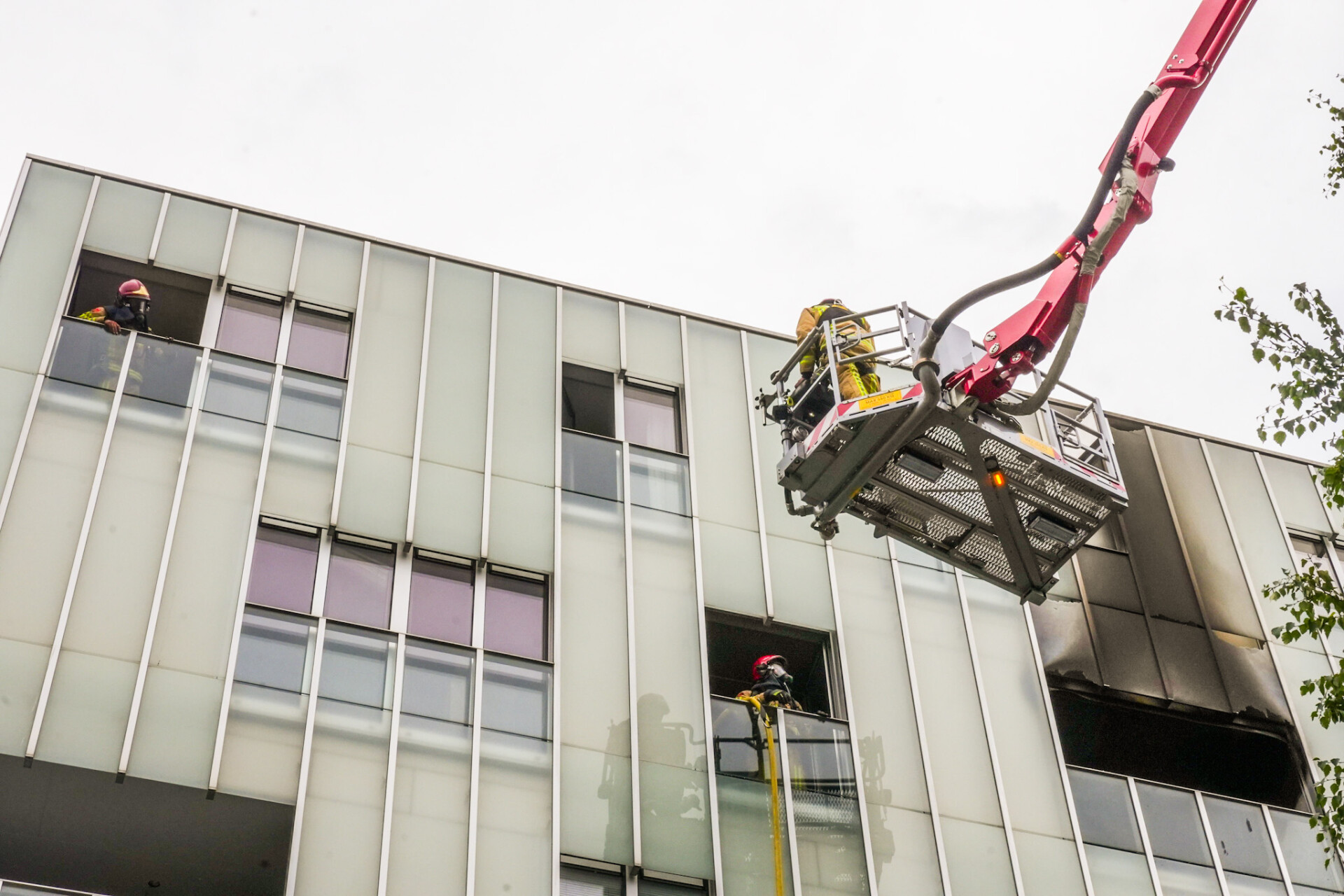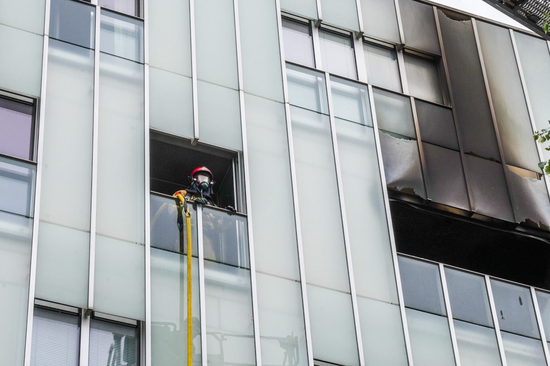 Voor de veiligheid heeft de brandweer enkele glazen panelen van de wand verwijderd.