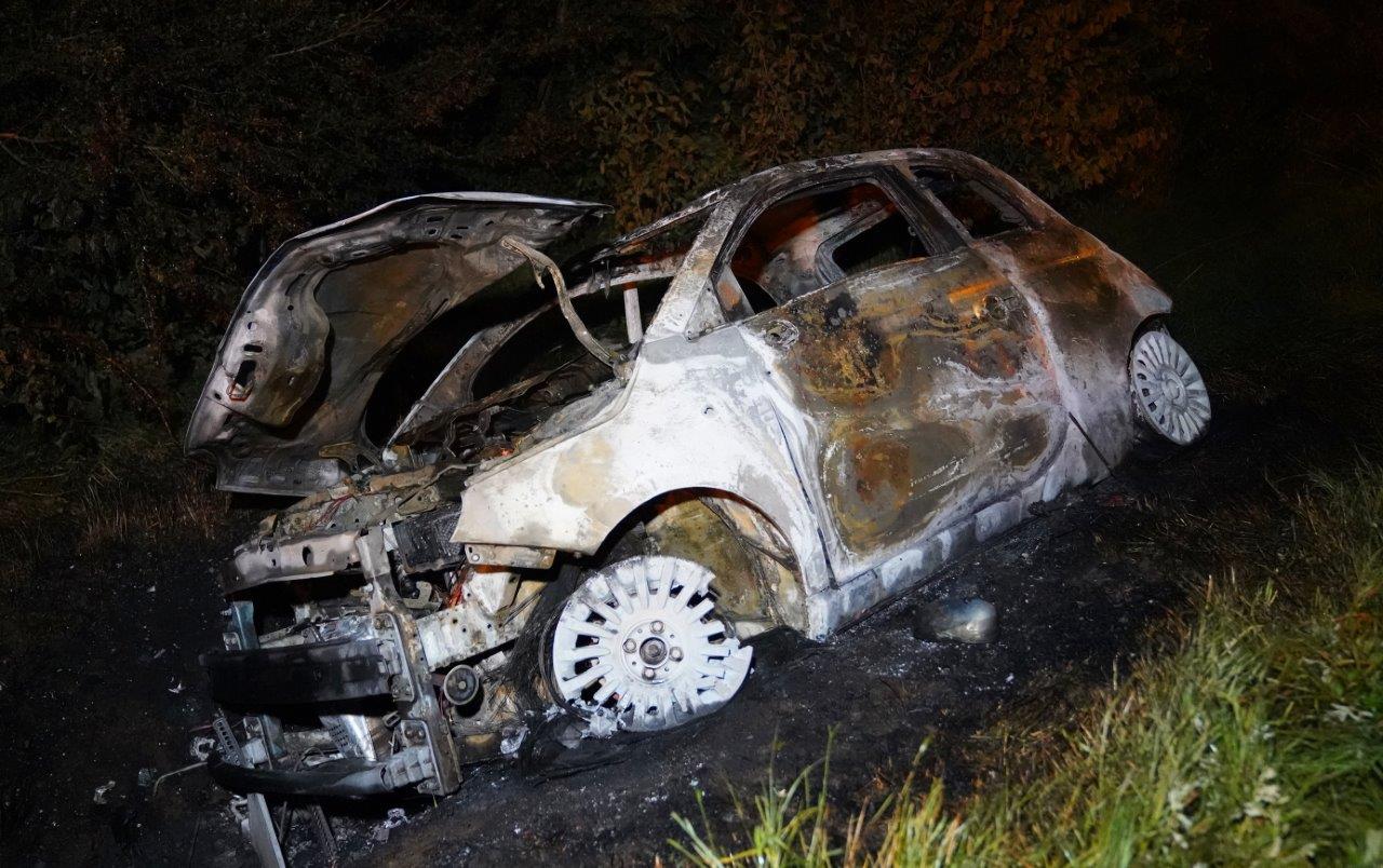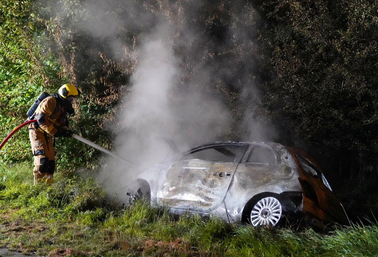 De melding kwam rond 01:15 uur binnen. Bij aankomst stond de auto volledig in brand, liggend op zijn kant in een greppel. Er lag glas op de weg en een spoor leidde naar de sloot. De brandweer bluste de brand en zocht naar inzittenden. Het voertuig bleek gestolen.