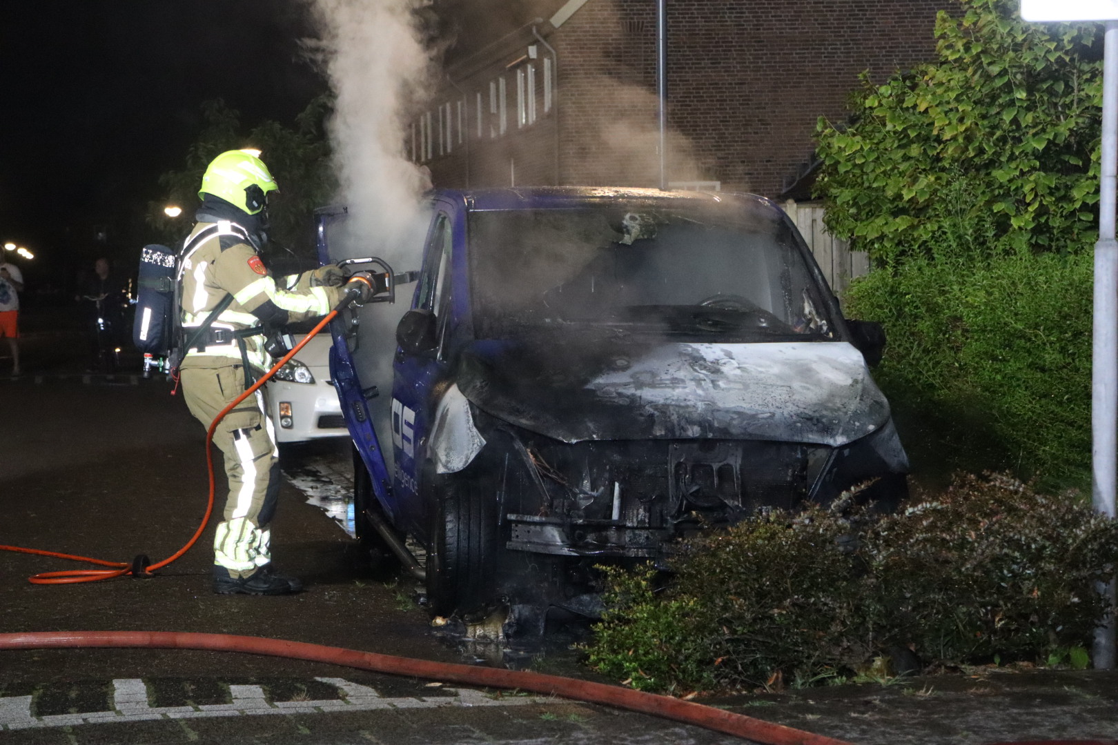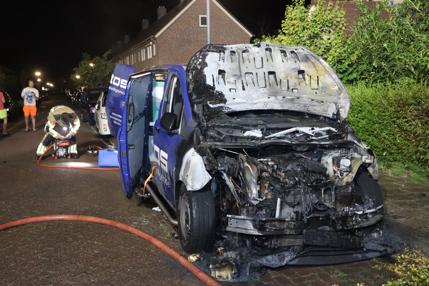 Kort voor de brand hoorden buurtbewoners een harde knal. De brandweer was snel ter plaatse en had het vuur snel onder controle, waarbij ze enkele portieren moesten openbreken. Drie koelgasflessen in de bus werden veiliggesteld. De bestelbus brandde aan de voorkant volledig uit, maar de eigenaar kon nog spullen uit de bus halen.