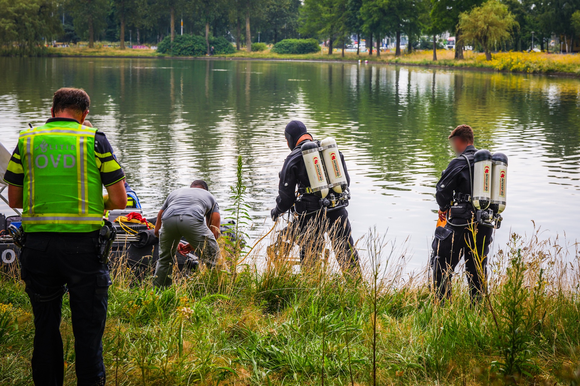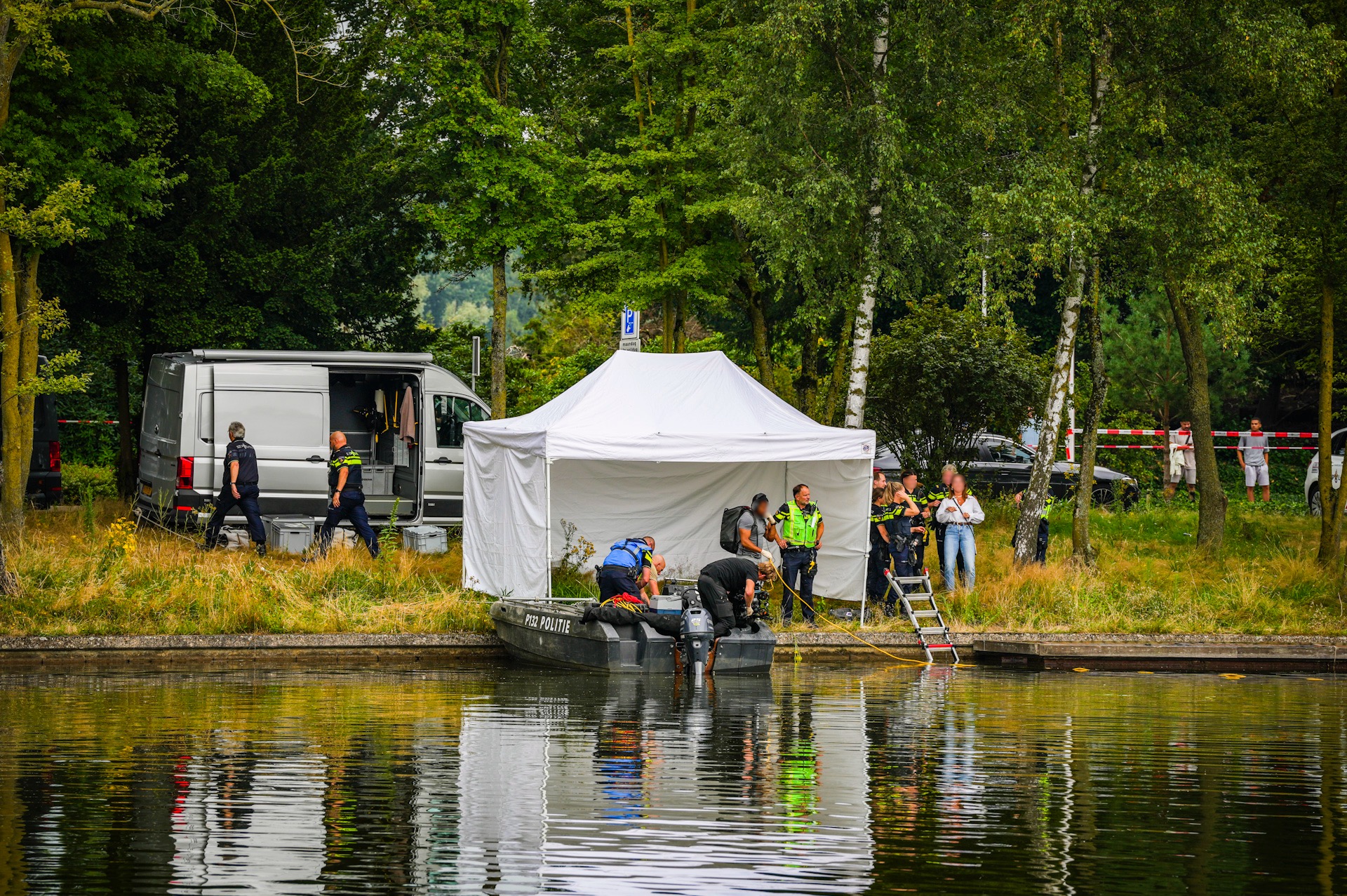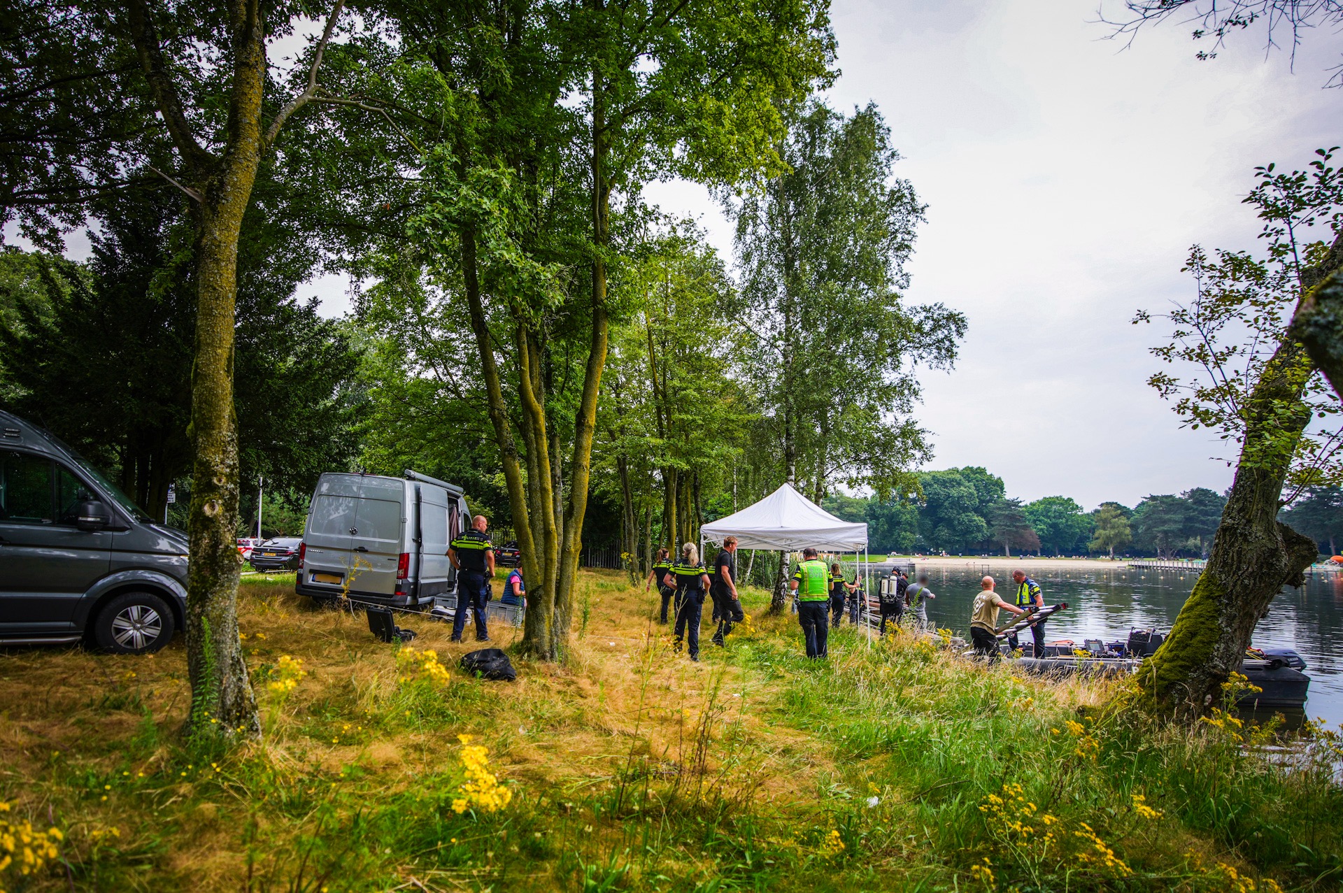 Het Landelijk Team Onderwaterzoekingen (LTOZ) was sinds woensdagochtend met een speciale zoekboot bezig. Rond drie uur ’s middags kon de politie nog niet bevestigen of het om de vermiste zwemmer ging. Tijdens de zoektocht werd aan de overkant van de vijver nog gezwommen.