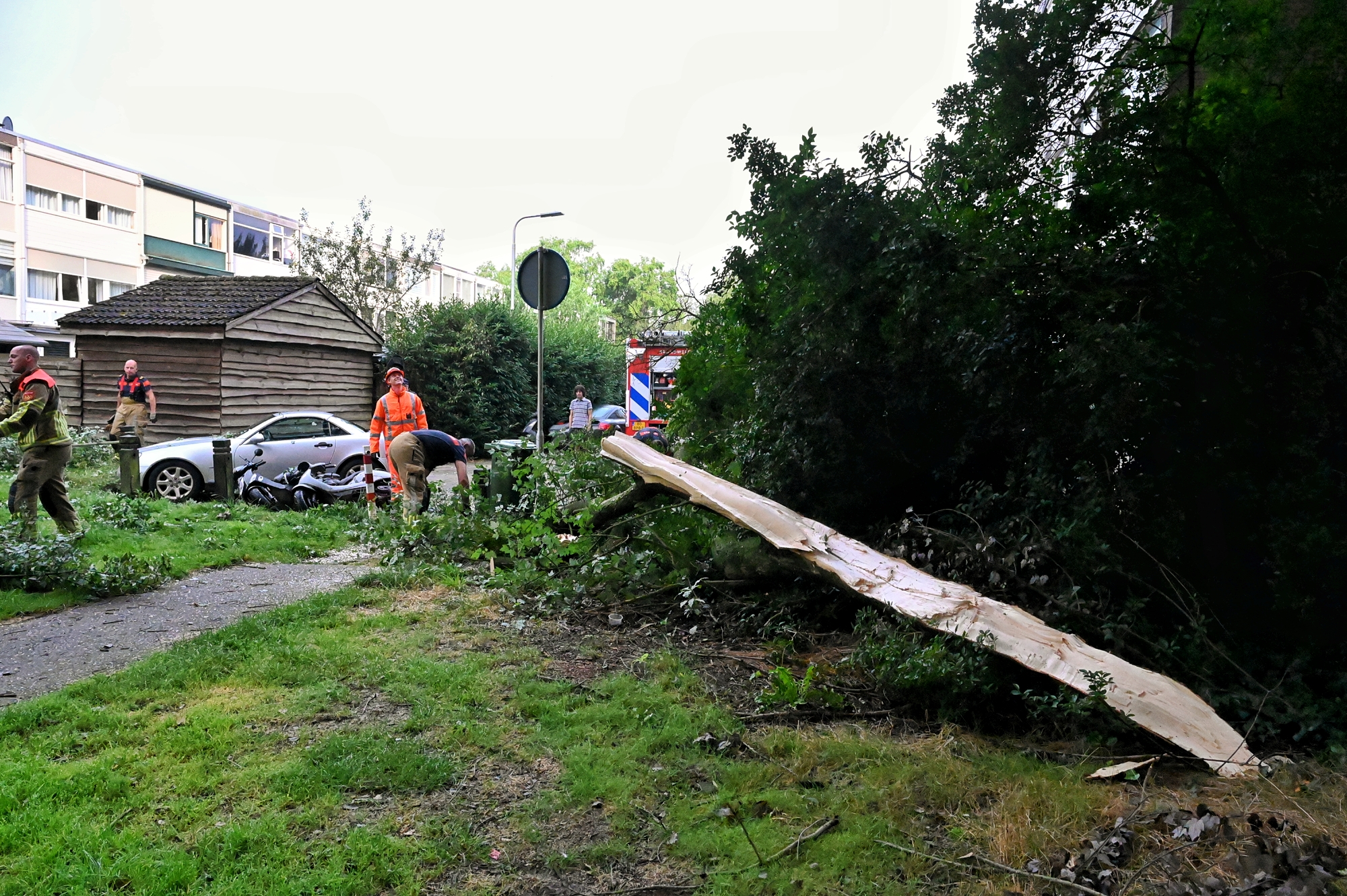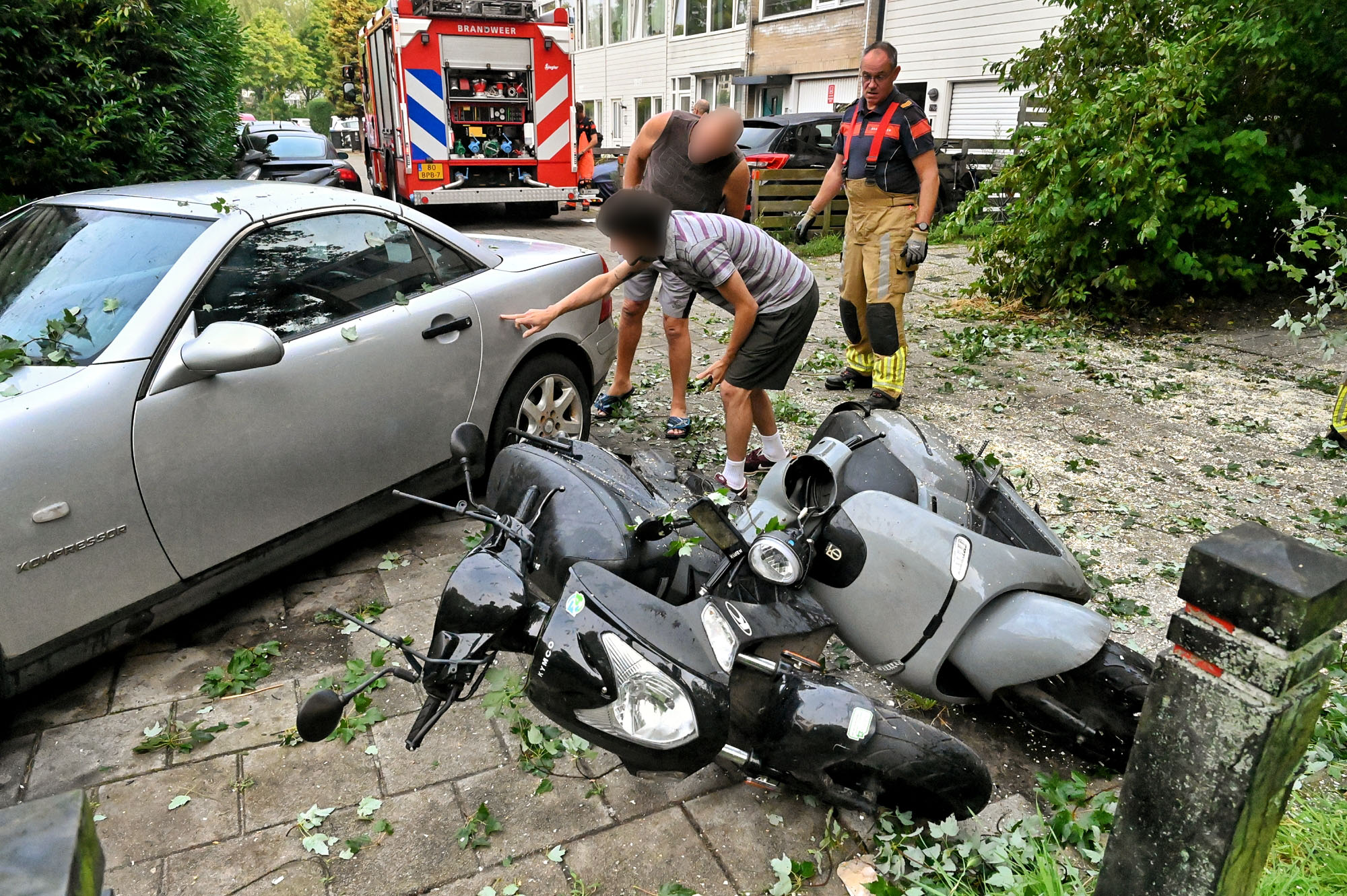 Voordat de brandweer werd ingeschakeld, probeerden buurtbewoners zelf het hout te verwijderen, maar dit bleek onmogelijk. De brandweer kwam ter plaatse om te assisteren. De auto en de scooters zijn flink beschadigd. De politie heeft de gedupeerden aan de deur geïnformeerd. Eén van de gedupeerden meldde dat hij rond 06:00 uur thuiskwam van zijn werk en toen lag het boomdeel al op de voertuigen.