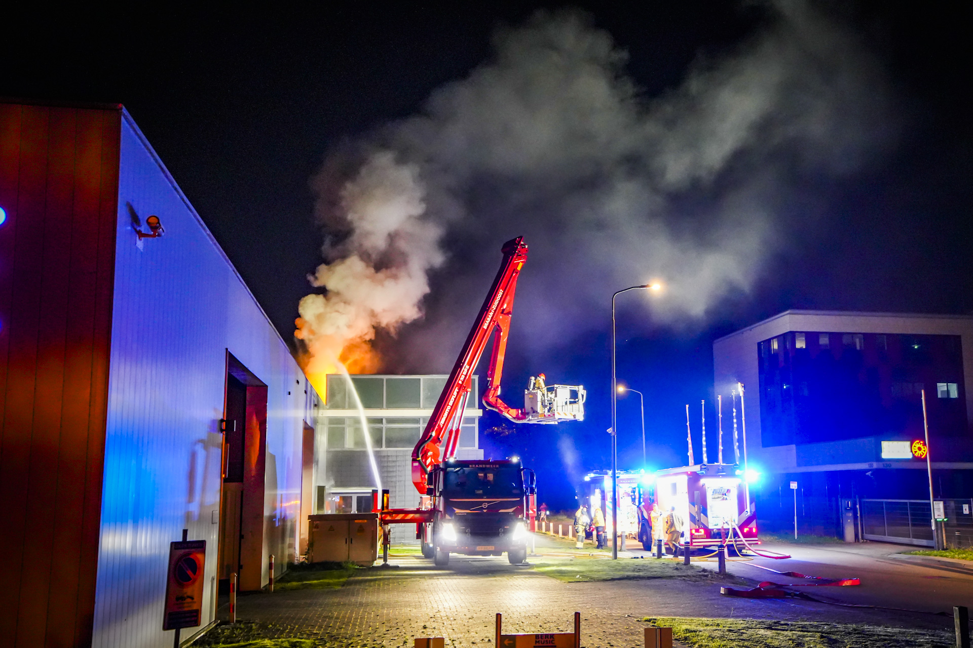 Brand op dak bedrijfsgebouw, vlammen ver in de omtrek te zien