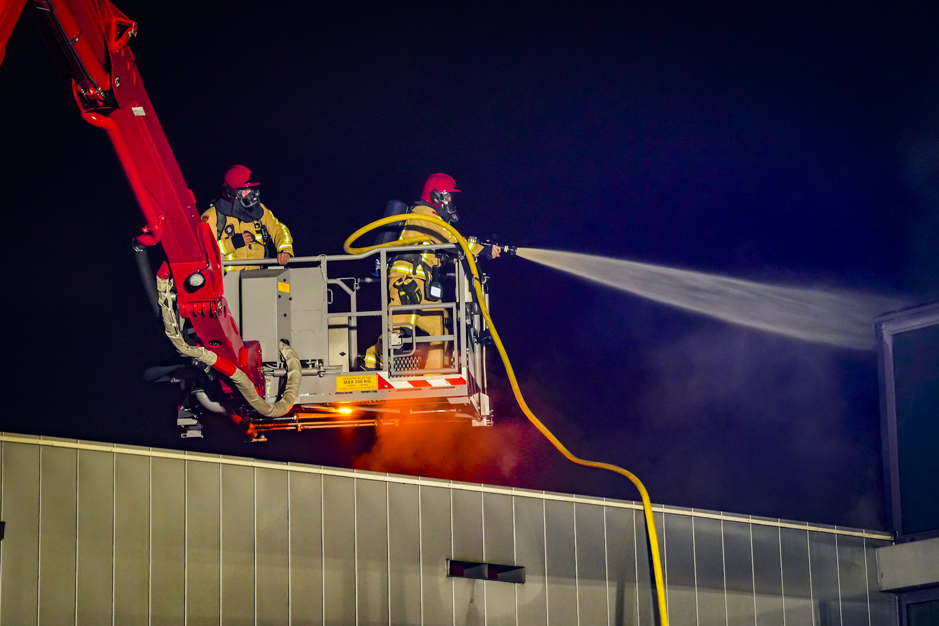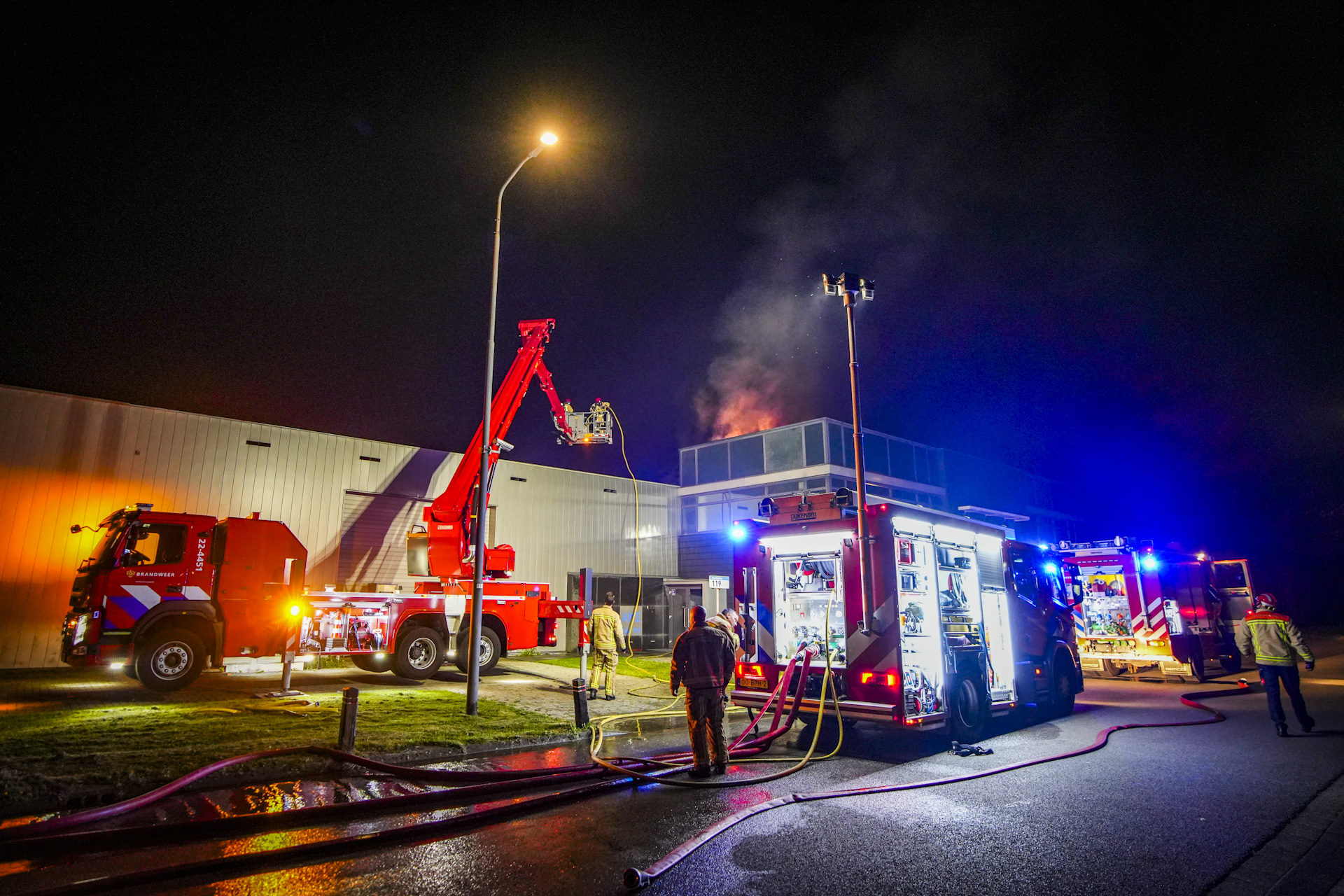 Brand op dak bedrijfsgebouw, vlammen ver in de omtrek te zien