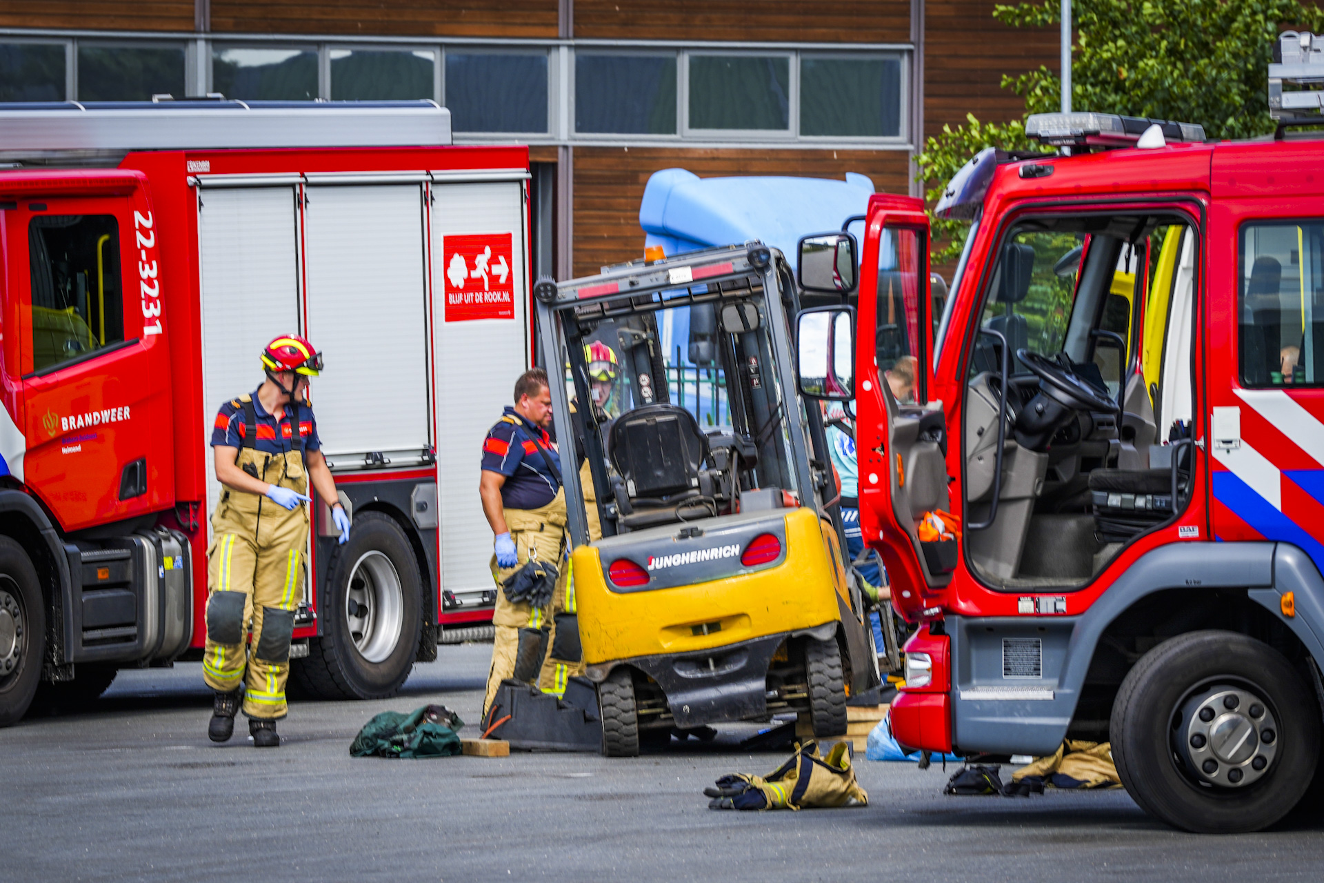 Uiteindelijk werd de heftruck aan één kant opgetild, waarna de man eronder vandaan kon worden gehaald. Ook een traumateam uit Rotterdam kwam per helikopter ter plaatse. Het slachtoffer liep voornamelijk ernstig letsel aan zijn benen op en werd over de weg naar Nijmegen vervoerd.