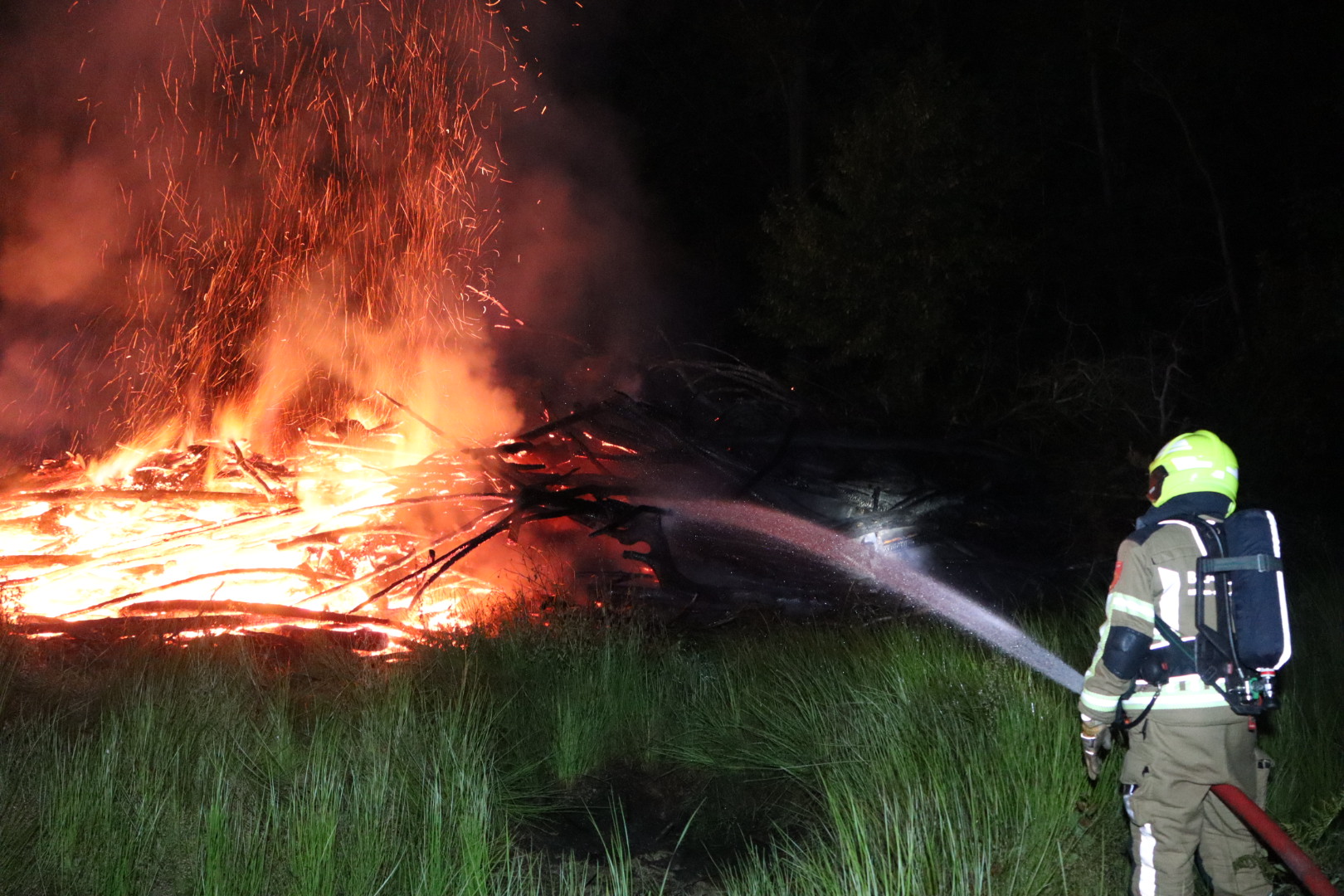 Er waren meldingen van een harde knal. De brandweer had enige moeite om de locatie te bereiken en kwam met één tankautospuit en twee waterwagens ter plaatse om de brand te blussen. Ze waren geruime tijd bezig met het blussen.