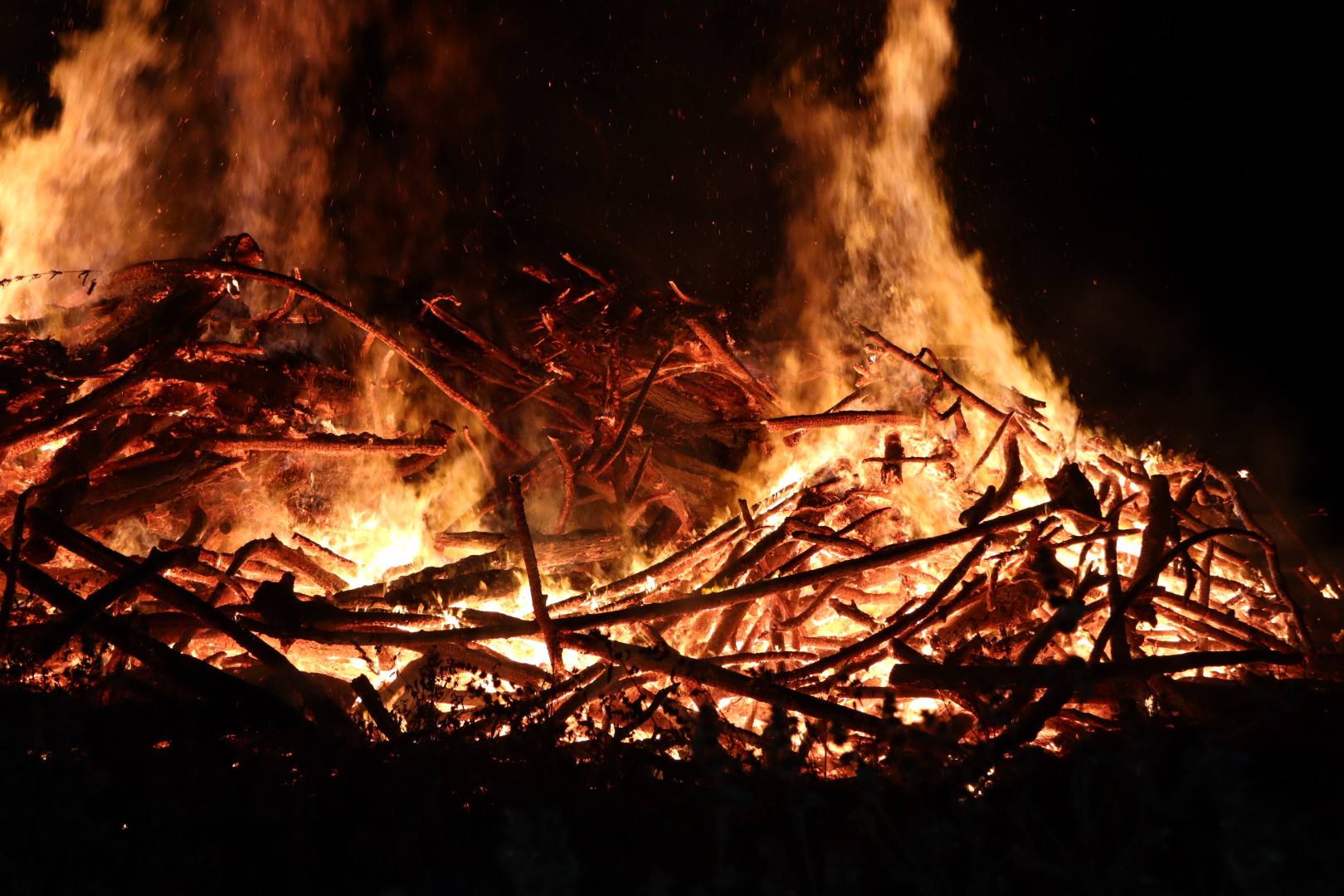 Metershoge vlammen in bos door brandende stapel takken