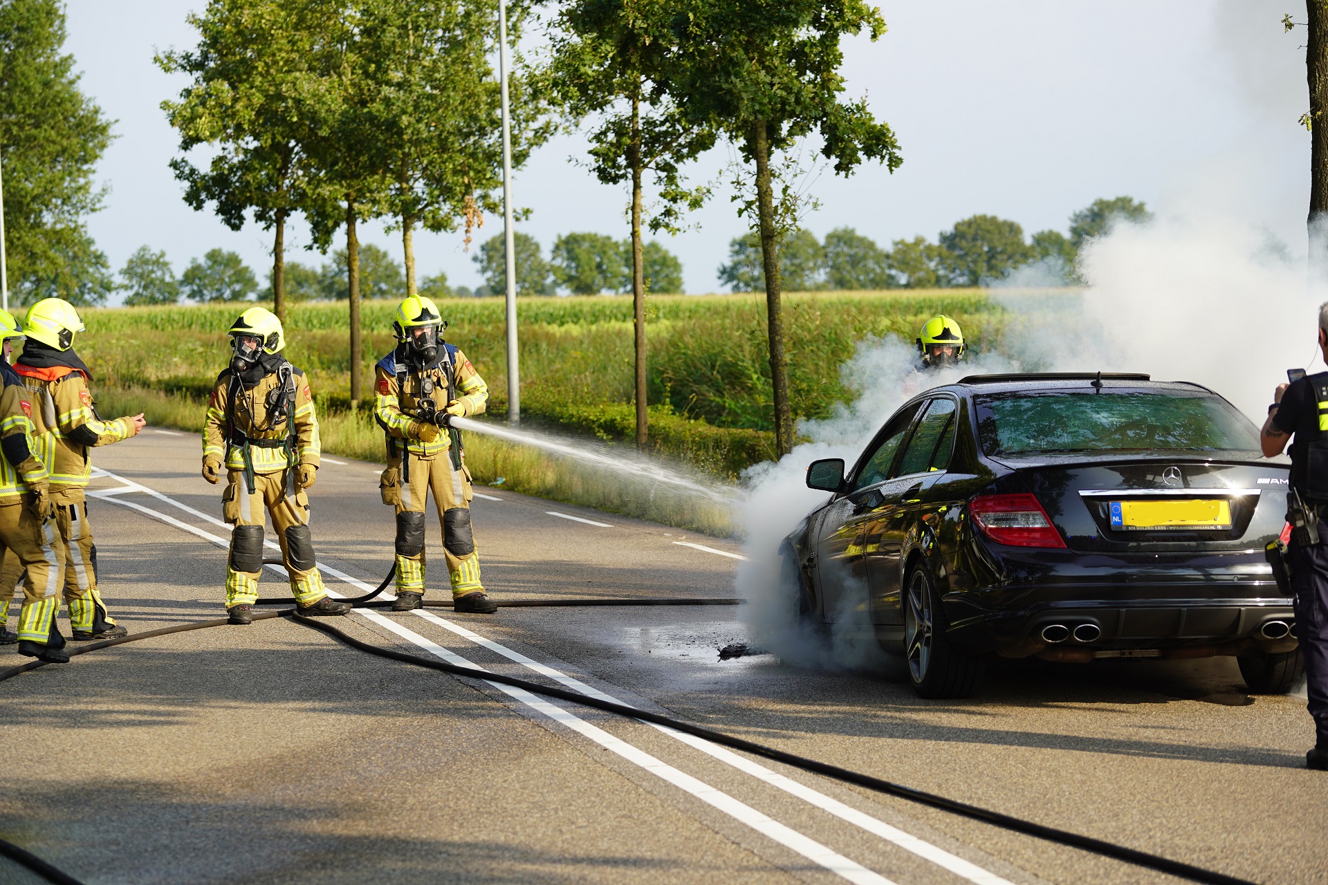 De auto vloog tijdens het rijden in brand. De brandweer kon niet voorkomen dat de auto grotendeels uitbrandde. De bestuurder raakte niet gewond.