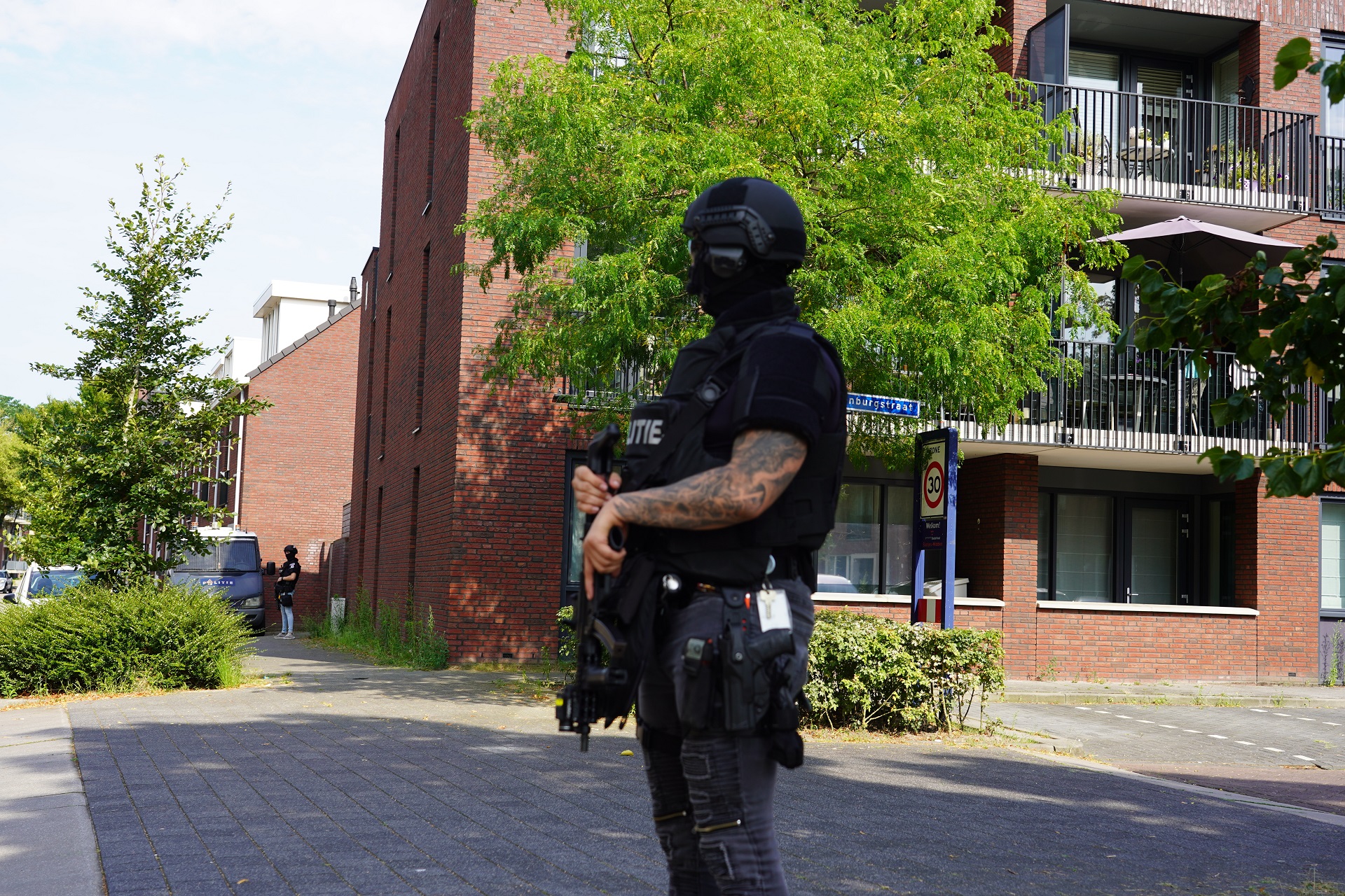 Op straat rondom het appartementencomplex staan zwaarbewapende agenten op wacht.