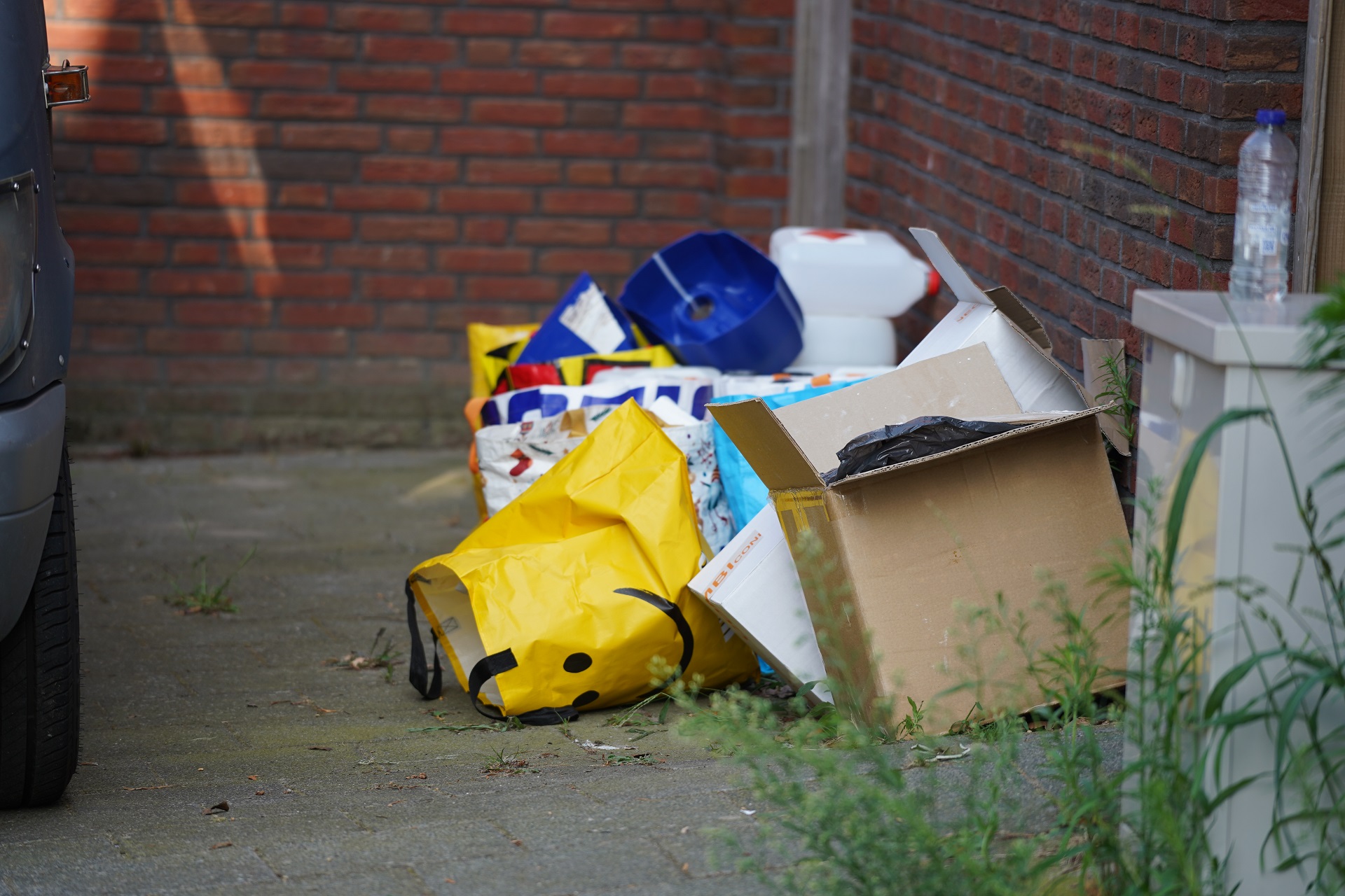 Uit een schuurtje zijn tassen met jerrycans gehaald. De recherche voert onderzoek uit in de woning, terwijl ook de Landelijke Faciliteit Ontmantelen van de politie aanwezig is.