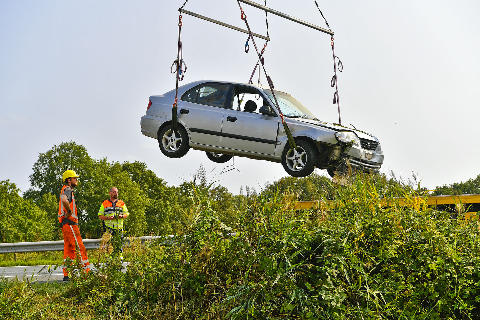 Er zijn geen gewonden, en het verkeer kan stapvoets passeren. Het beschadigde voertuig wordt getakeld en afgevoerd.