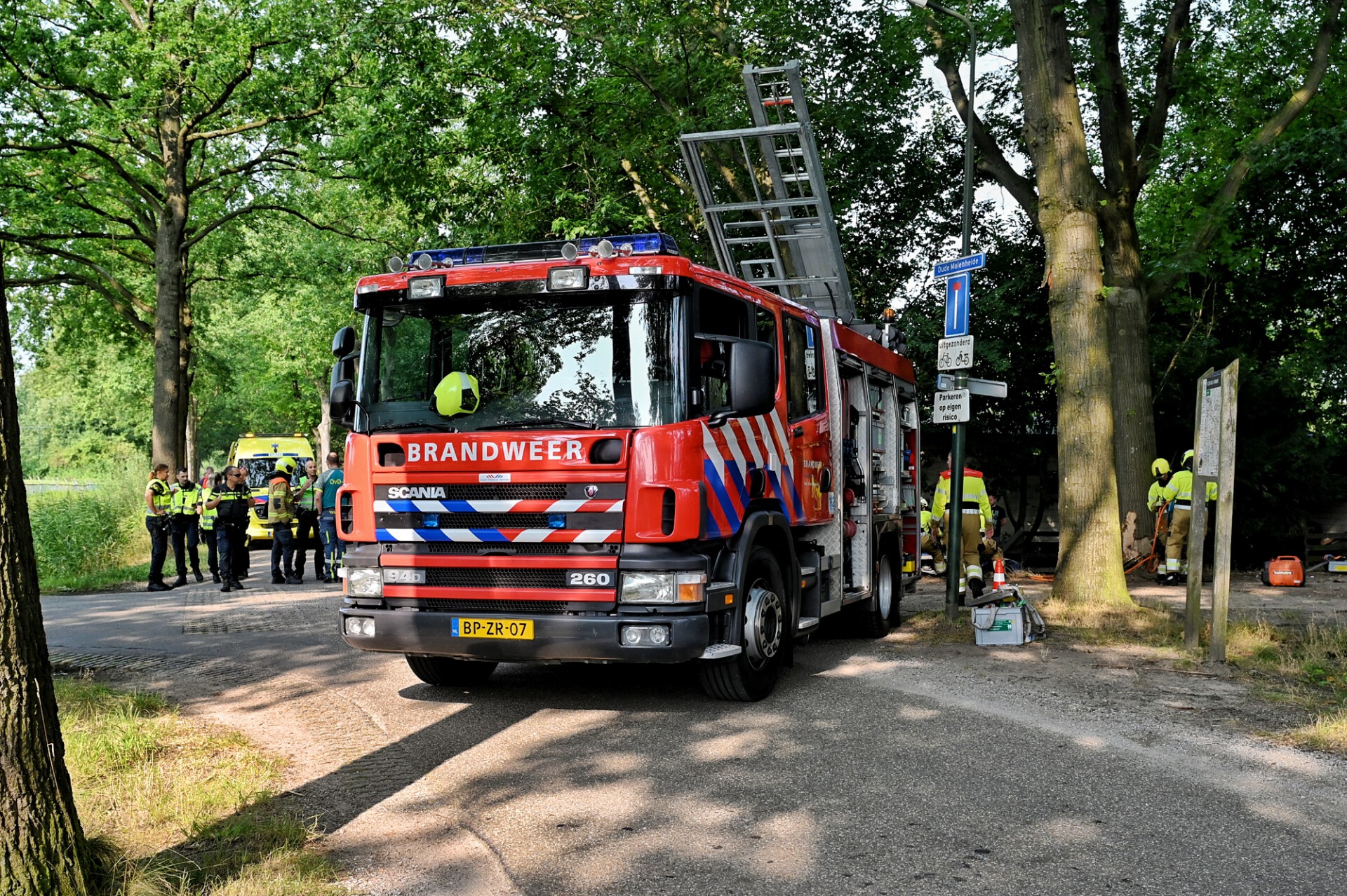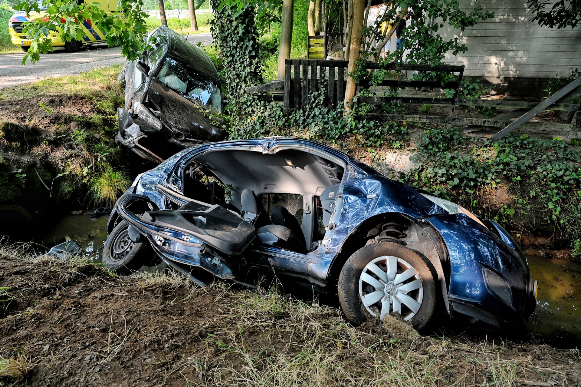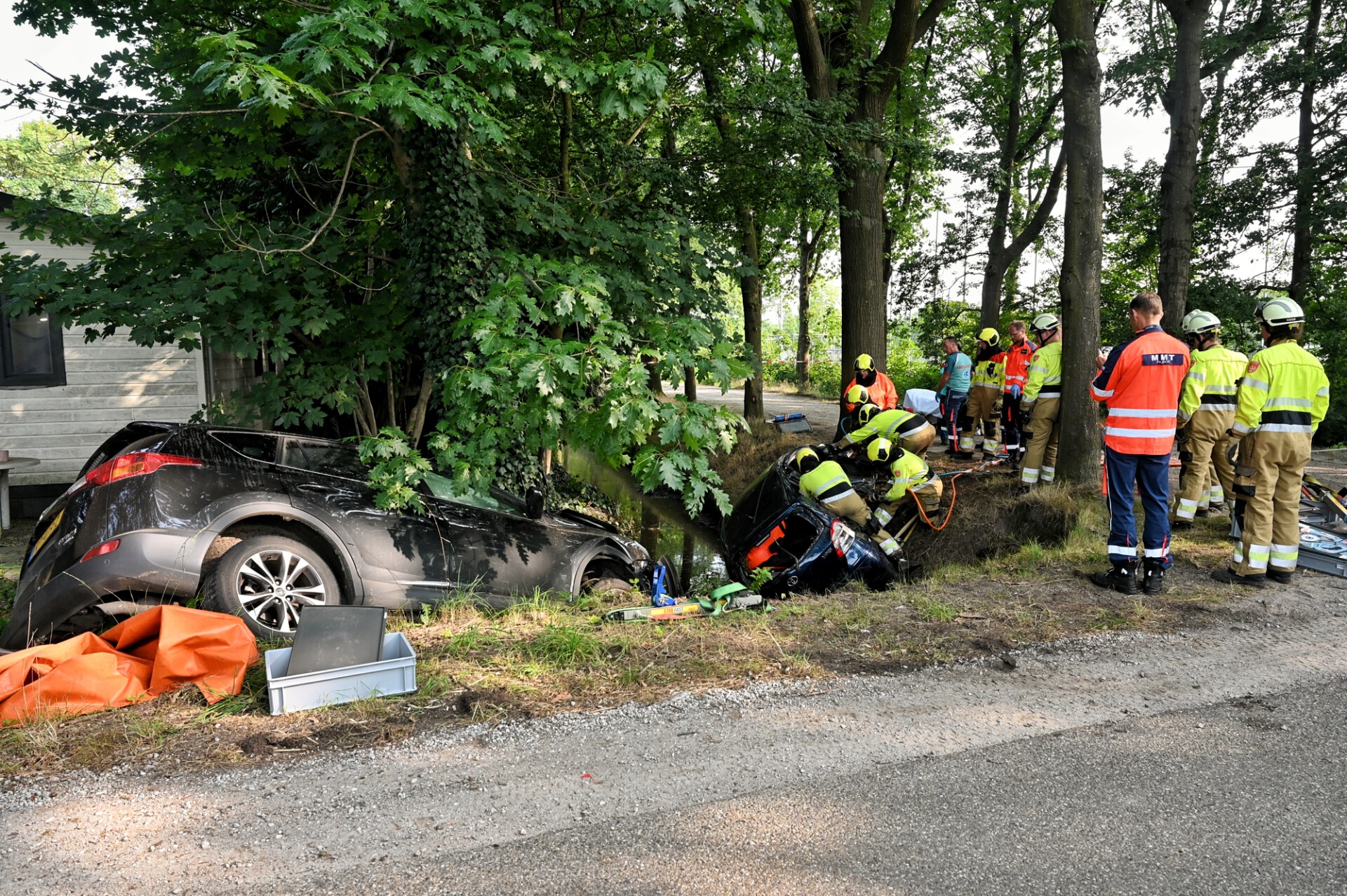 Door de klap belande beide auto’s tegen een boom en in een sloot met water. Hulpdiensten kwamen groots met spoed ter plaatse, ook een traumahelikopter is geland. Een man zat bekneld in zijn voertuig. De brandweer heeft deze auto open geknipt waarna meneer bevrijd kon worden. De andere bestuurder raakte licht gewond en is ter plaatse behandeld.