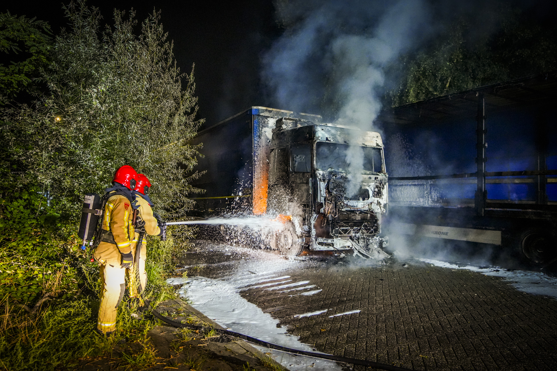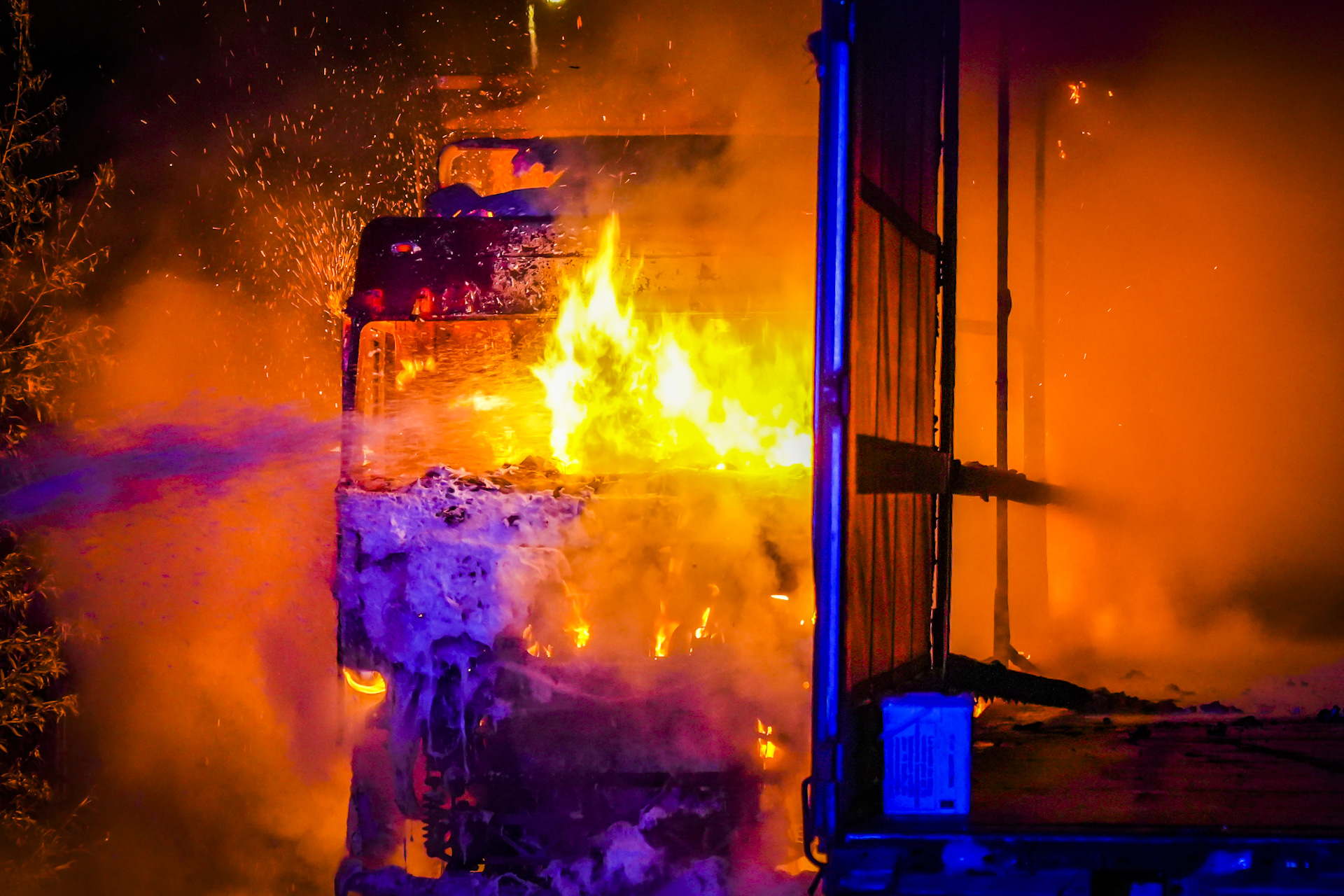 Vrachtwagen en trailer door brand verwoest, mogelijk brandstichting