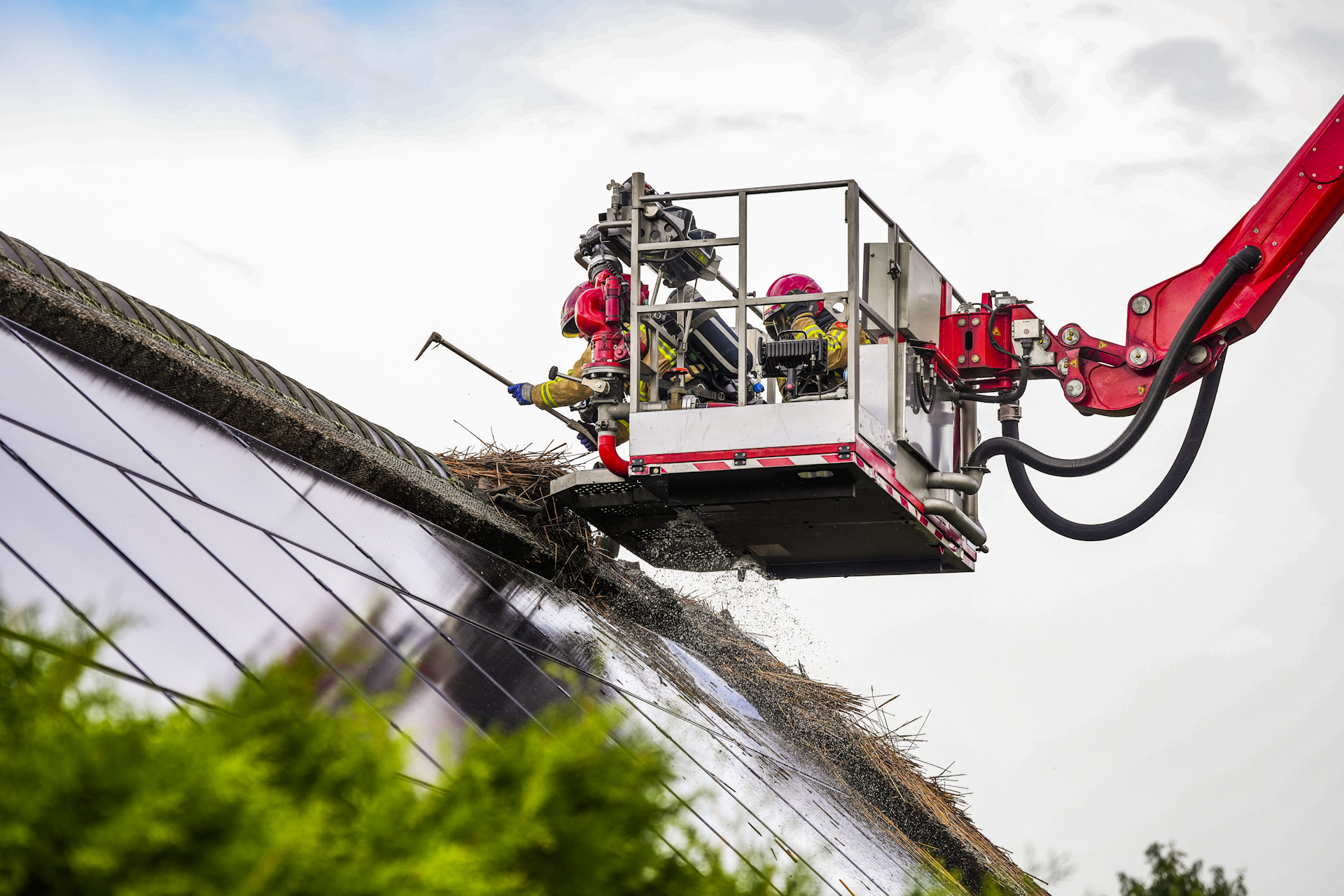 De brandweer schaalde meteen op en riep een speciaal rietdakteam uit Gelderland in. Met een hoogwerker verwijderde de brandweer direct riet en delen van de dakrand om de brand onder controle te krijgen.