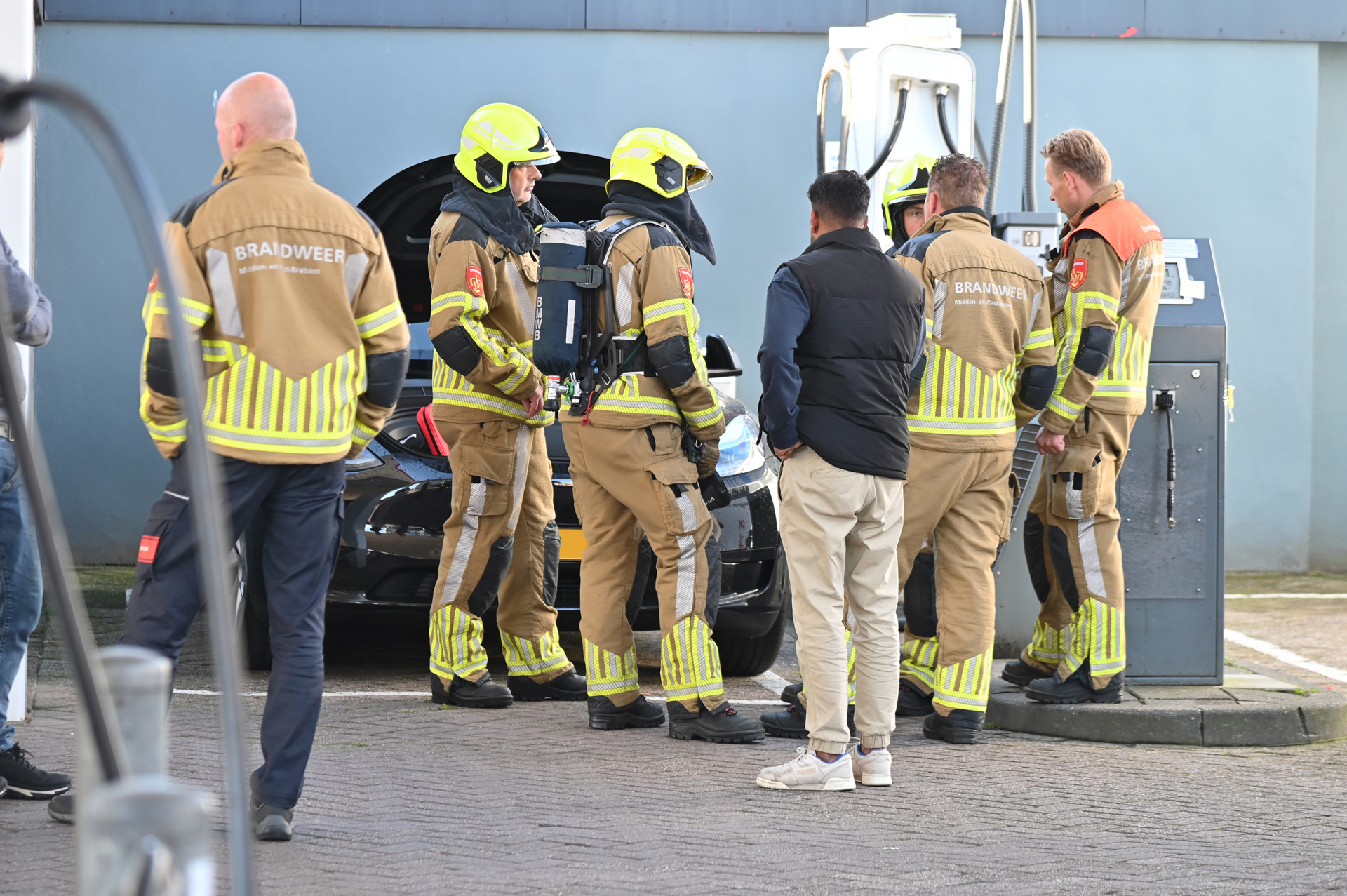 Het terrein werd afgezet voor het overige verkeer. Brandweerlieden waren druk bezig met een Tesla die naast de shop geparkeerd stond. Wat er precies aan de hand was, is niet bekend.