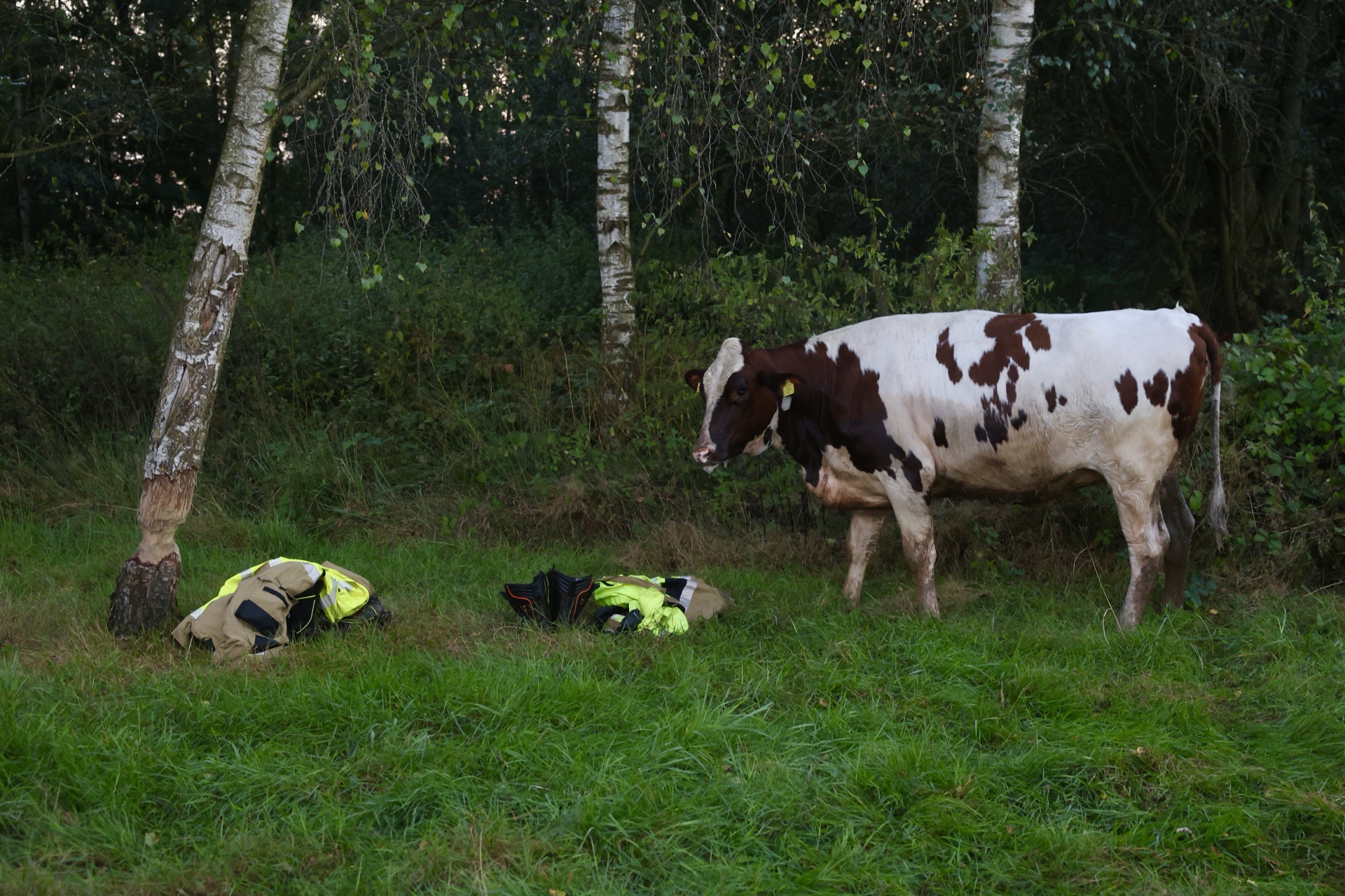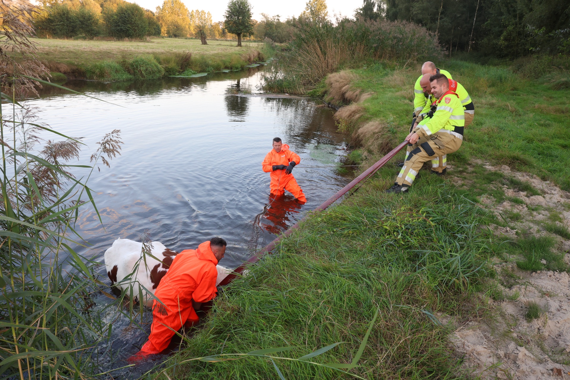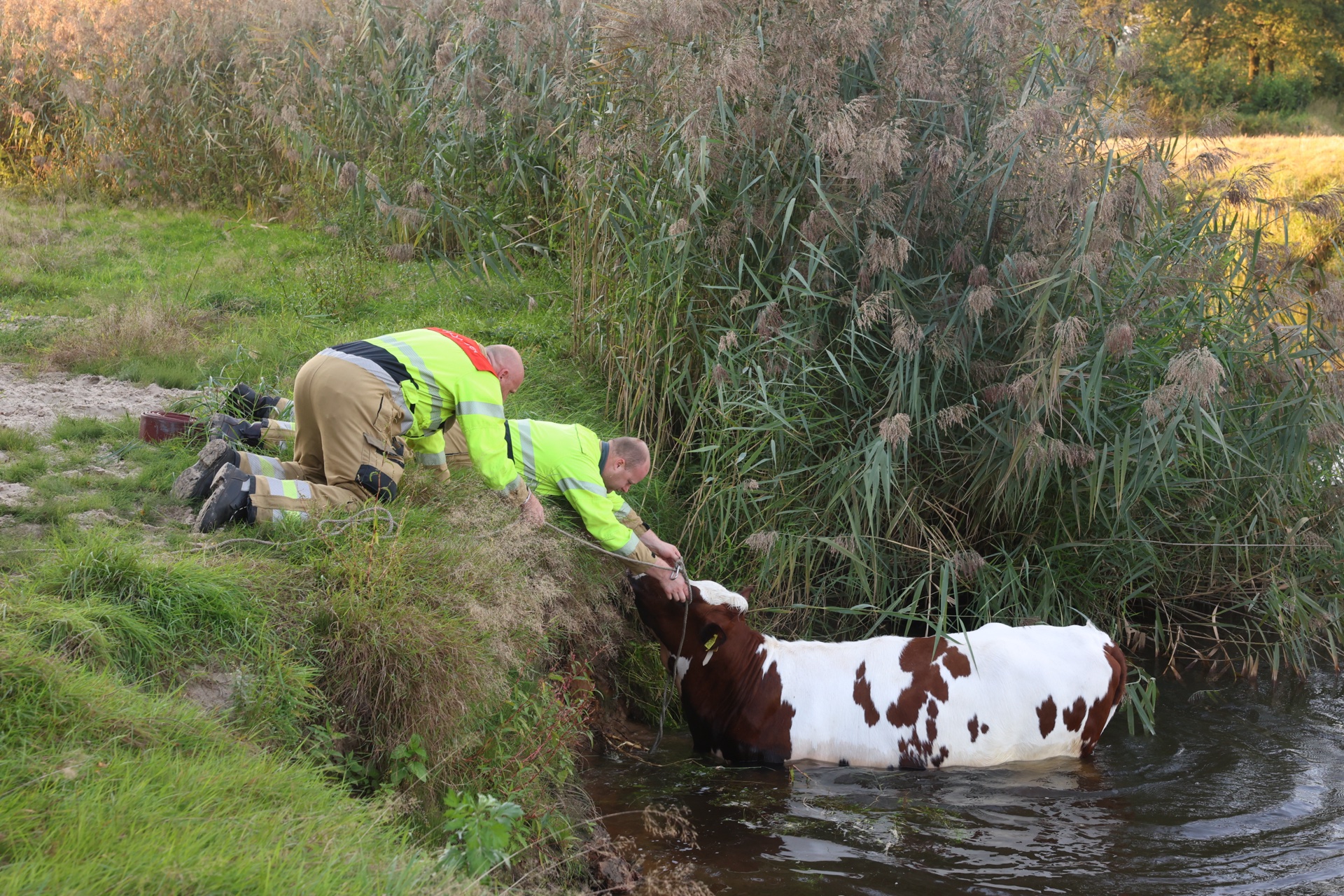 De brandweer probeerde de koe met slangen en touwen uit het water te trekken, maar het dier zat met zijn voorpoten vast in het zand. De eigenaar van de koe werd opgespoord en stuurde iemand met een tractor om te helpen. Ondanks de inzet van de tractor bleek het een lastige klus, maar uiteindelijk slaagde de brandweer er, samen met de tractor, in om de koe rond 20.00 uur op de kant te krijgen.