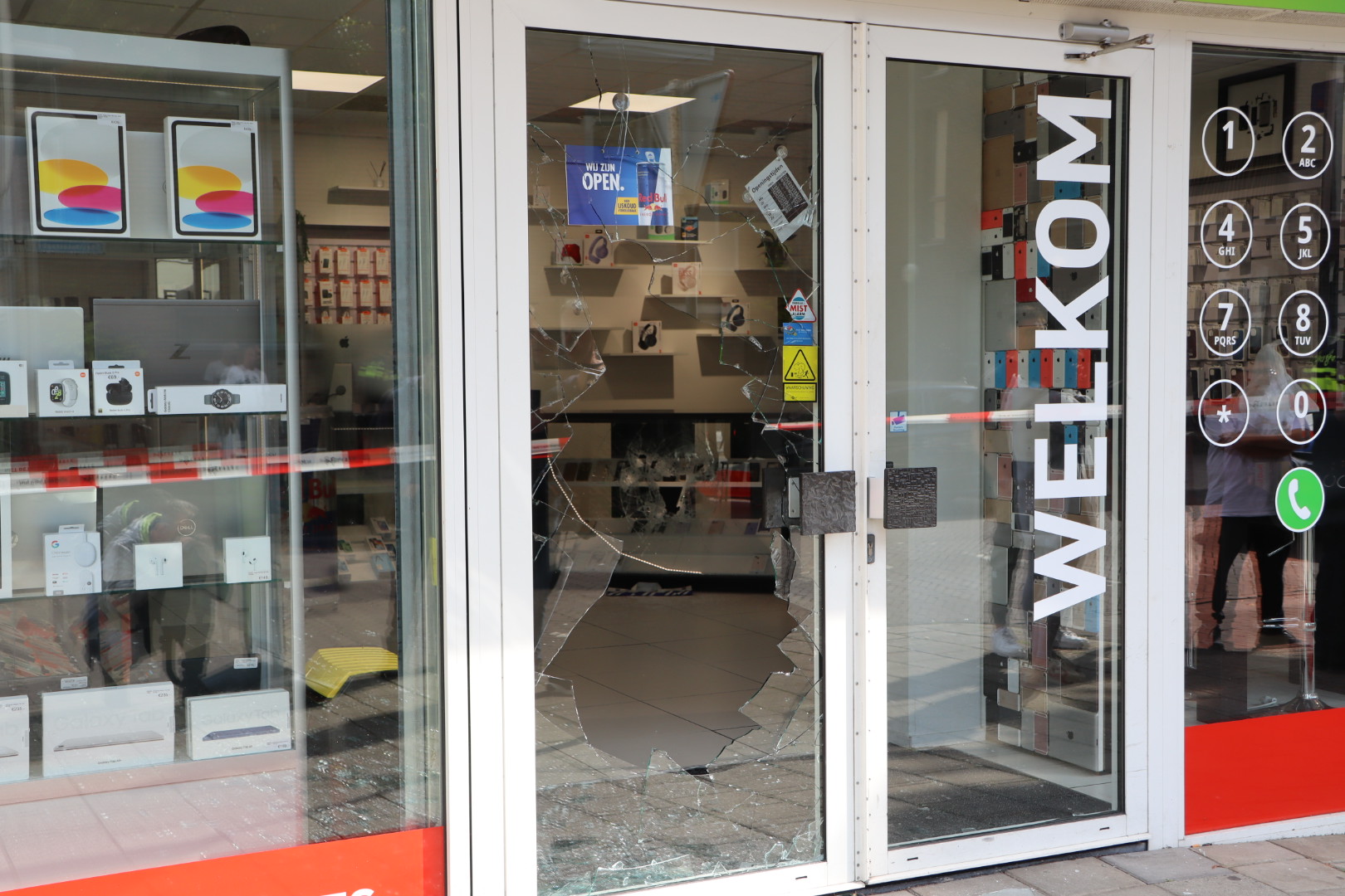 Bij de overval zouden volgens getuigen vuurwapens zijn gezien. De ruit van de winkeldeur is volledig vernield en vitrines zijn ingeslagen, vermoedelijk in een poging om dure telefoons buit te maken.