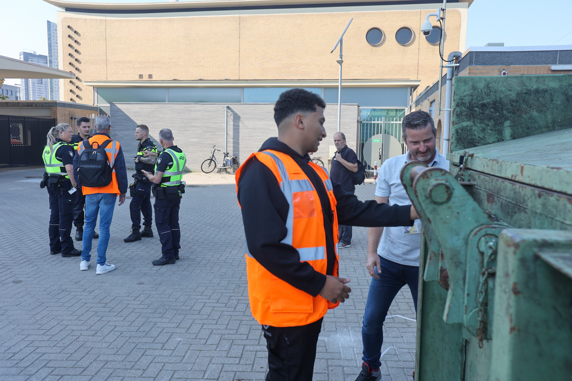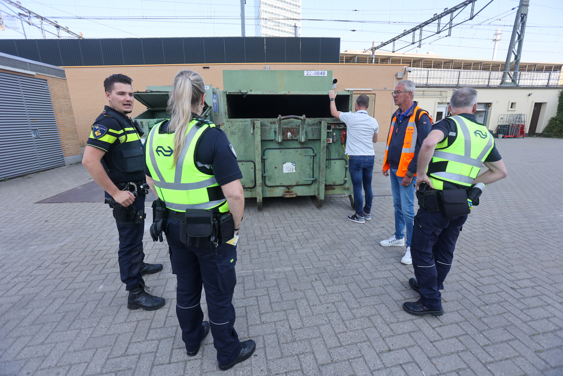 Volgens het personeel is de man dagelijks op zoek naar statiegeldflessen in de container. Hij wachtte de hulpdiensten niet af en vluchtte via een andere container en een muur het spoor op, waardoor het treinverkeer tijdelijk werd stilgelegd. De politie hield hem ter hoogte van de tunnel op de Fuutlaan aan, aangezien hij een gebiedsverbod had.