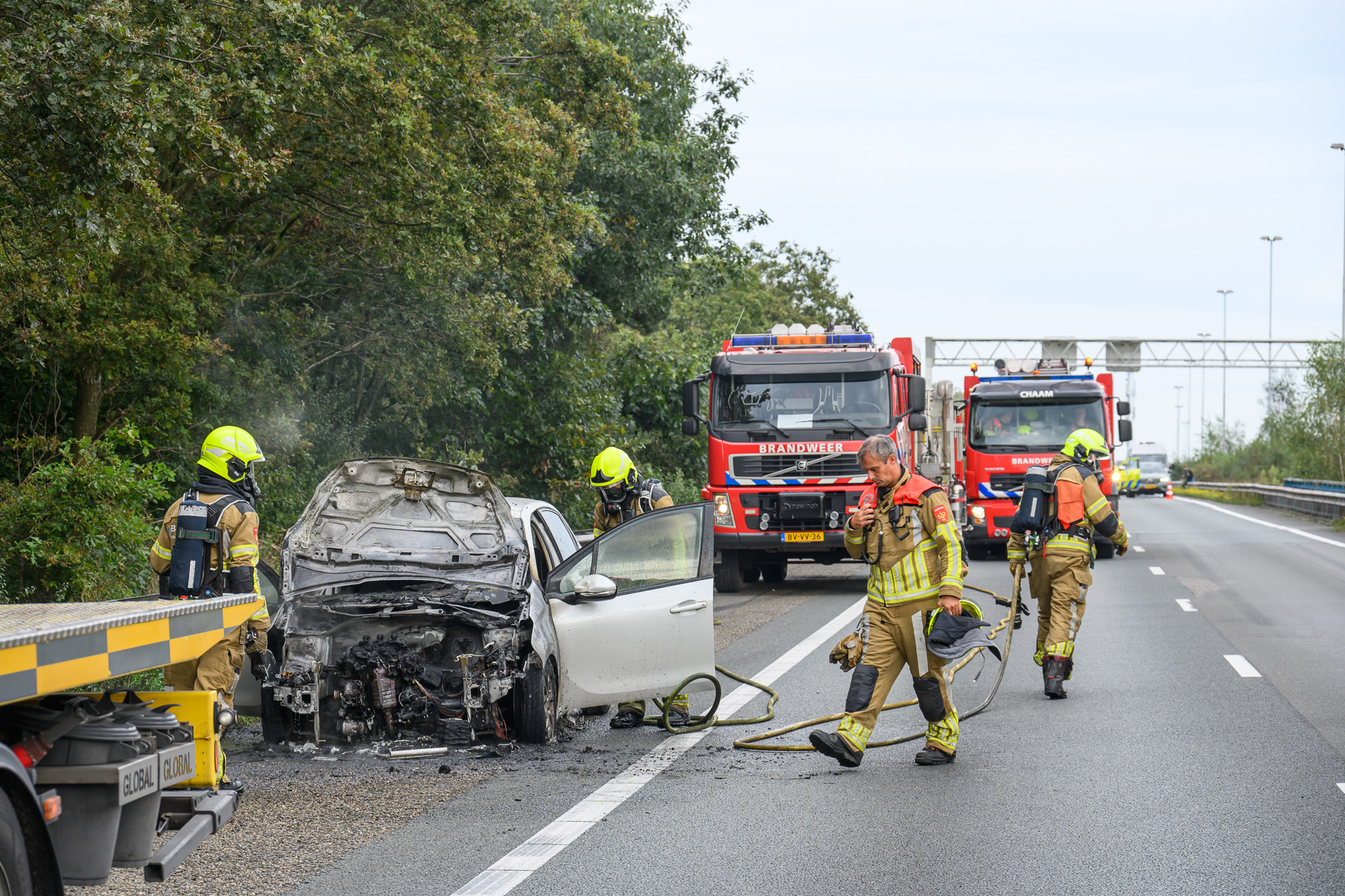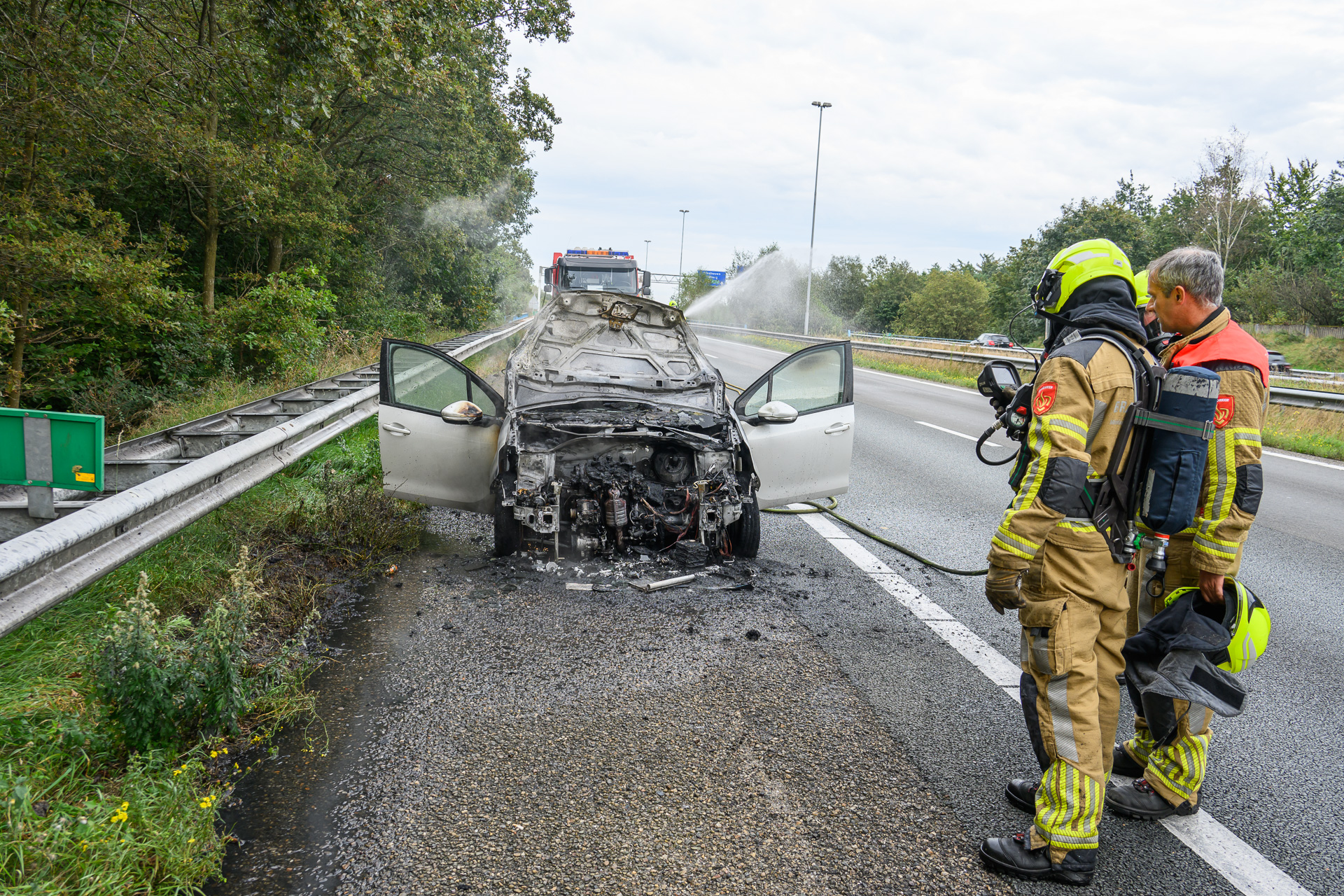 De brandweer arriveerde snel ter plaatse en wist de brand te blussen. Ondertussen werden de rijbanen tijdelijk afgesloten om de veiligheid te waarborgen. Nadat de situatie onder controle was, werd de weg vrijgegeven en een berger heeft de beschadigde auto weggesleept. Ondanks de schrik, bleef de bestuurster ongedeerd en kon het verkeer al snel weer doorgaan.