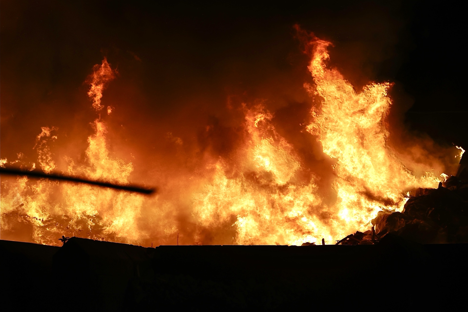 Grote berg afval in brand: metershoge vlammen, rook trekt over snelweg