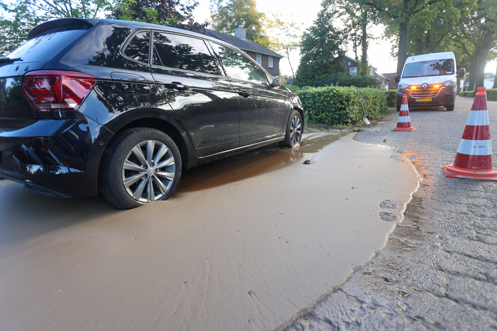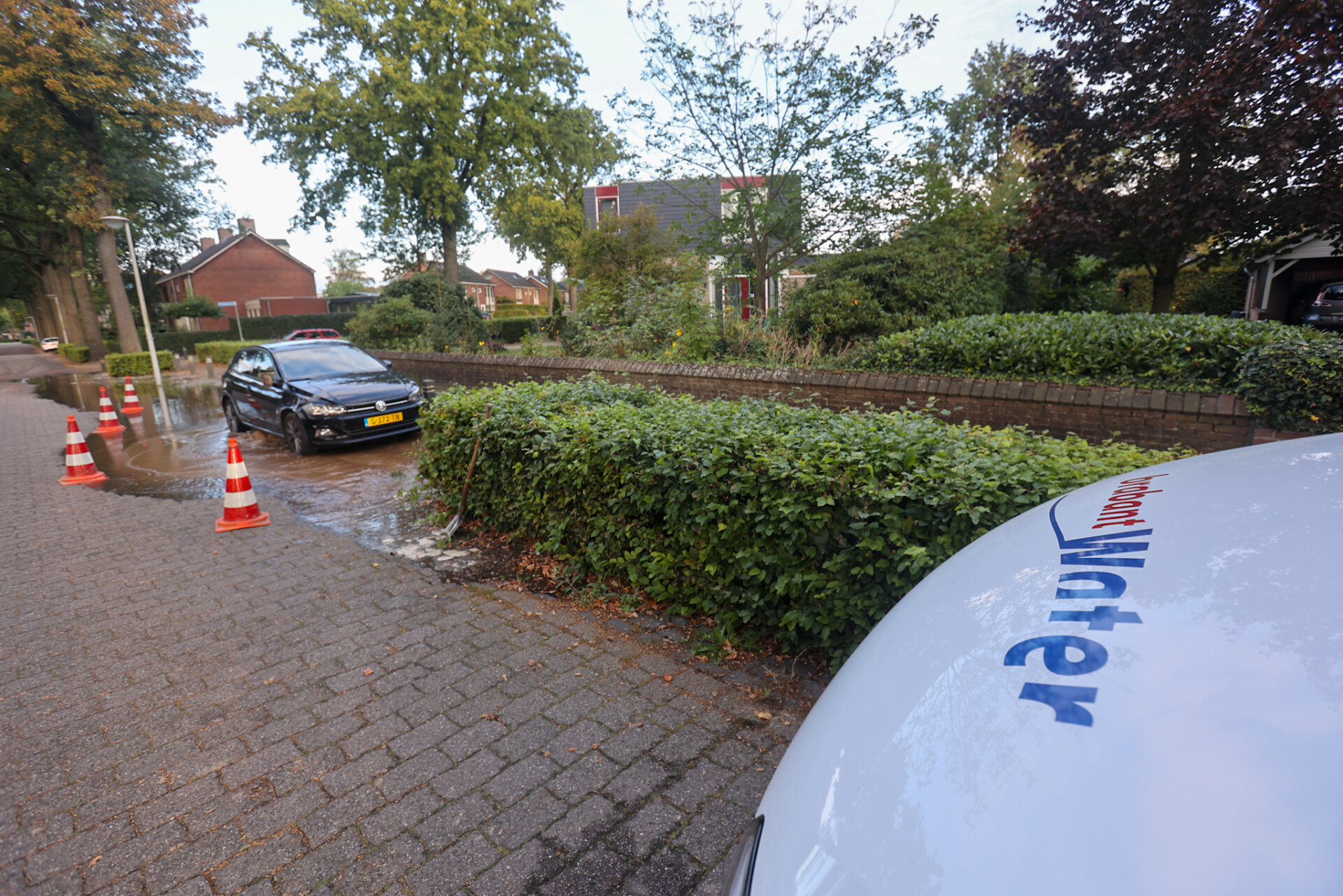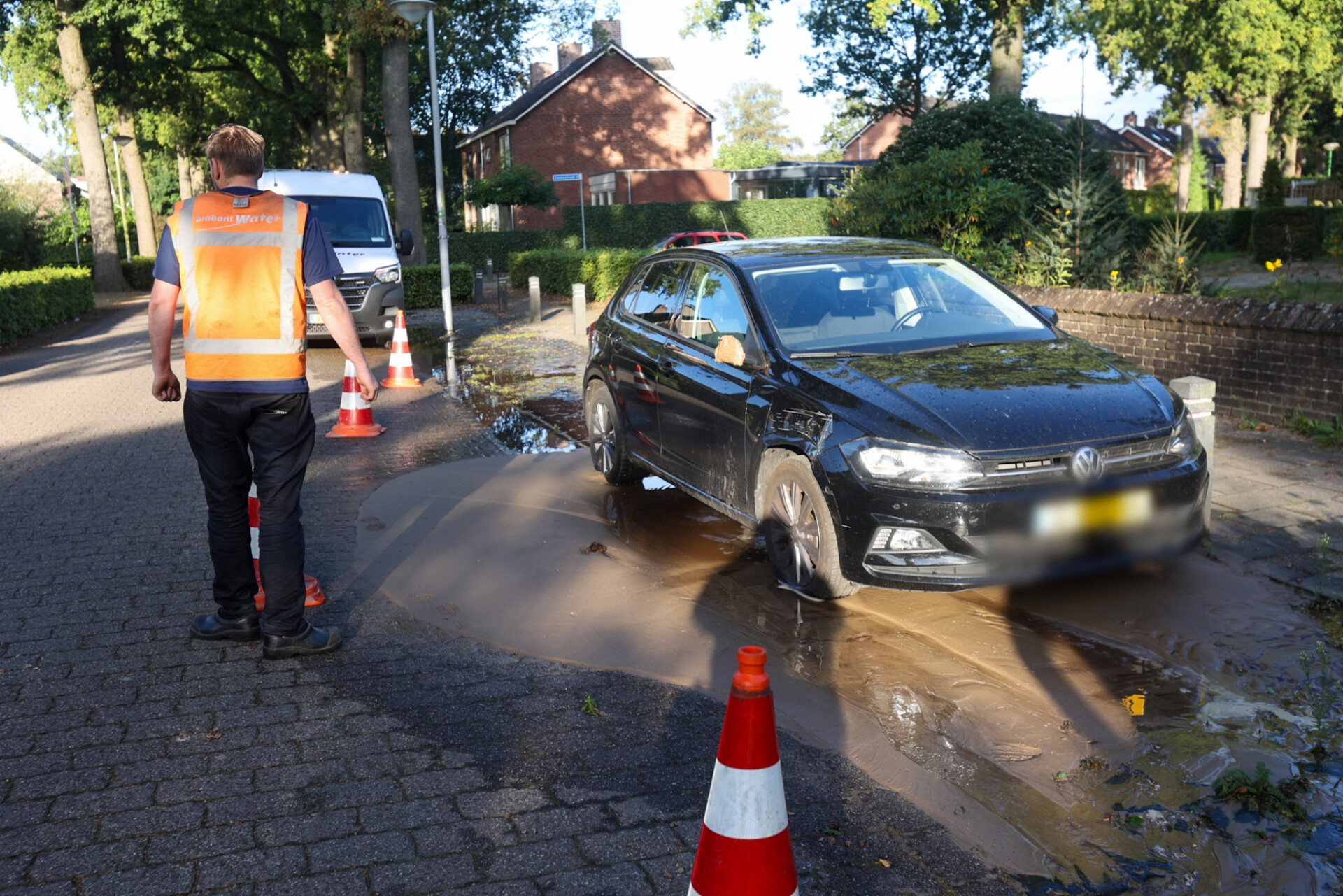 Wijk zonder water door gesprongen waterleiding, auto staat vast op sinkhole