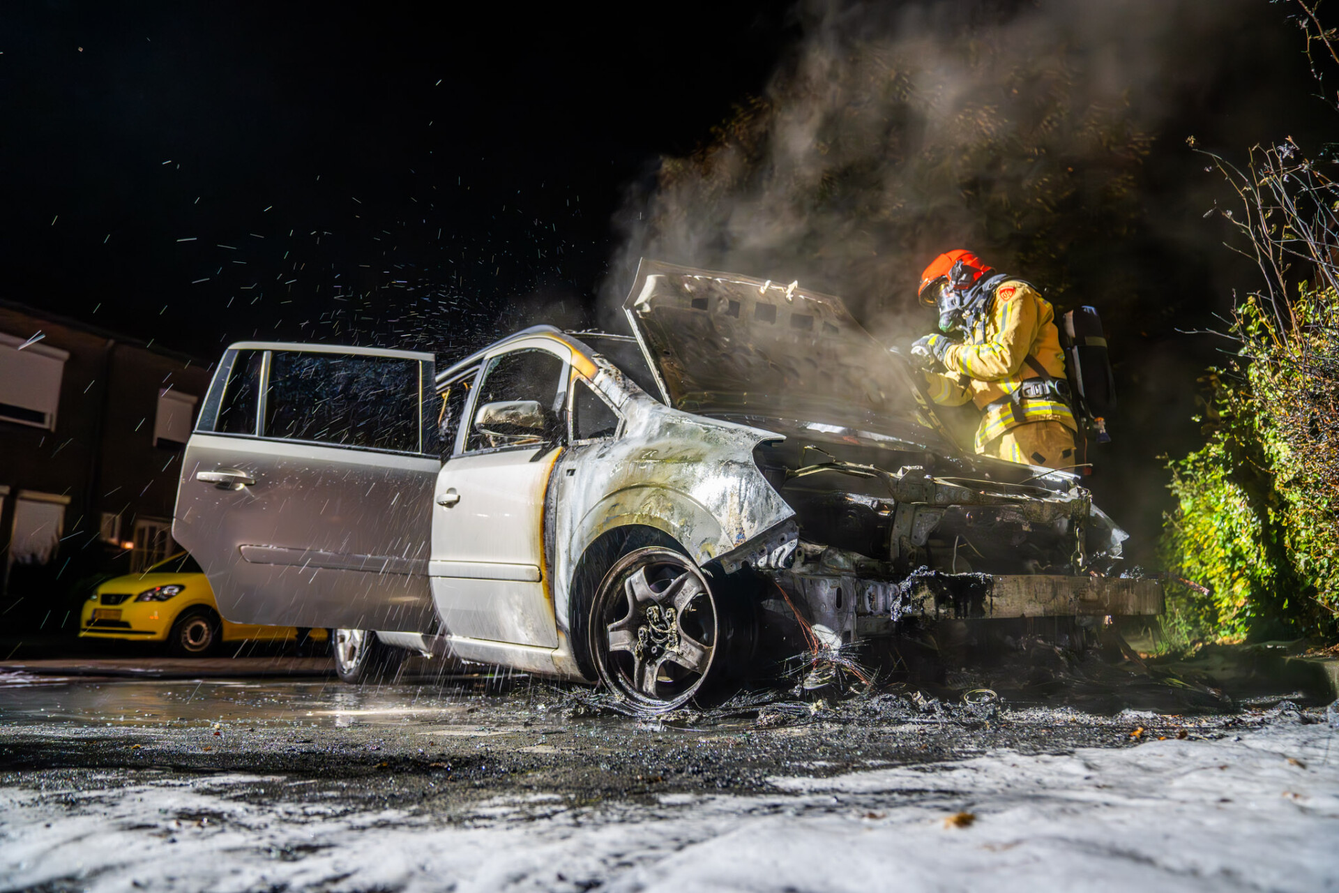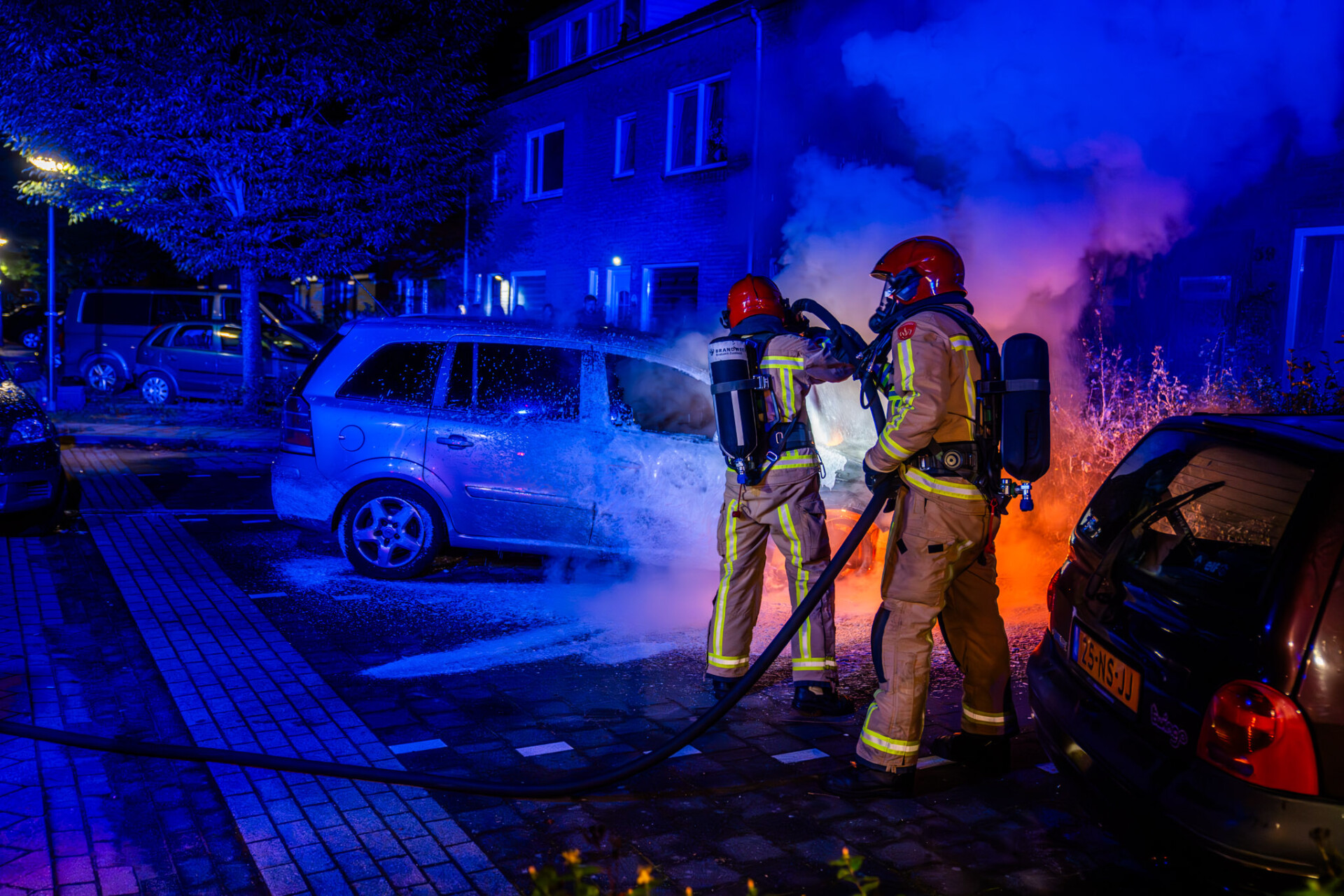 N.B. voor redactie, niet ter publicatie: Op straat hadden de eigenaar van de auto en de buren een hoogoplopende ruzie, mogelijk heeft dit iets met de brand te maken werd er geroepen maar dit kon de politie niet bevestigen.