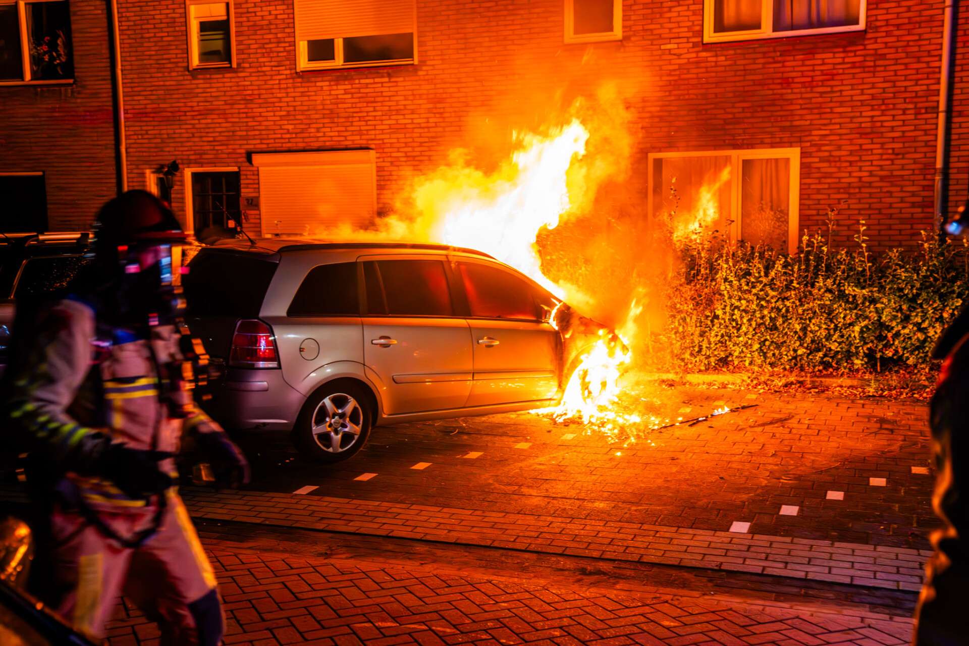 N.B. voor redactie, niet ter publicatie: Op straat hadden de eigenaar van de auto en de buren een hoogoplopende ruzie, mogelijk heeft dit iets met de brand te maken werd er geroepen maar dit kon de politie niet bevestigen.