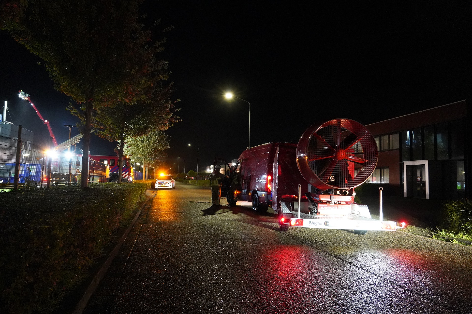 De brandweer schaalde op naar middelbrand en kreeg het vuur snel onder controle. Met behulp van een grote ventilator wordt de rook uit het pand geblazen.