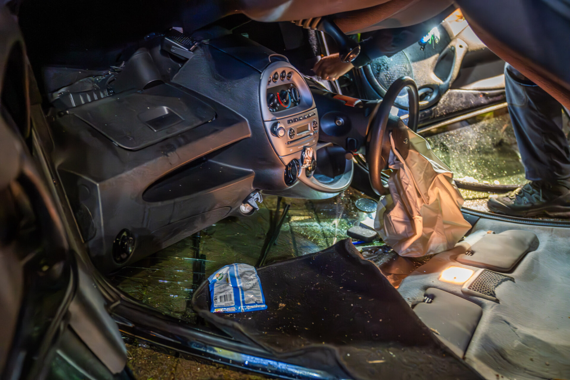 De automobilist, vermoedelijk onder invloed van alcohol, werd buiten de auto in het gras aangetroffen. In de auto lagen open blikken bier. De politie volgde de ambulance naar het ziekenhuis voor een bloedproef, en het rijbewijs van de bestuurder werd ingenomen.