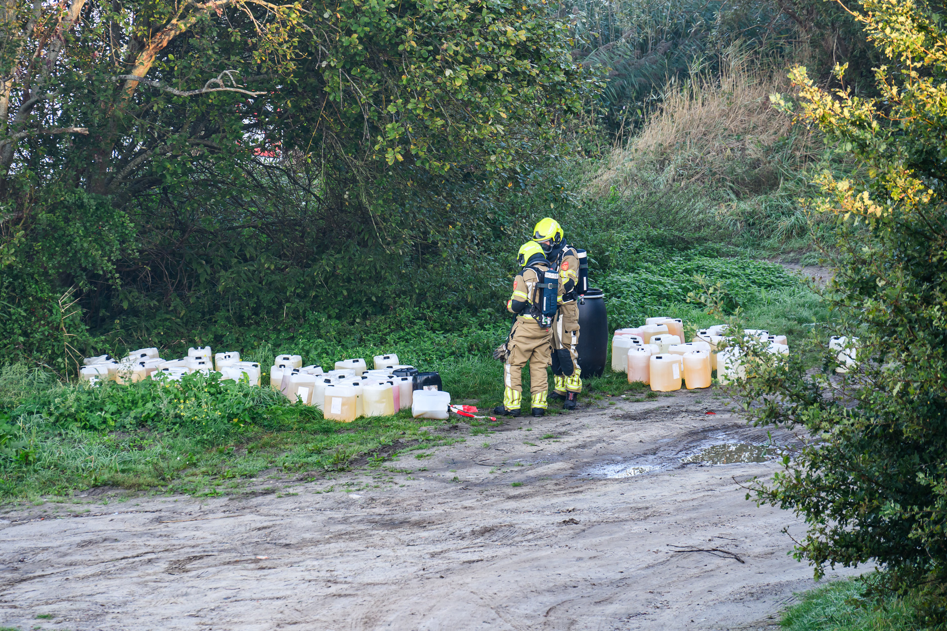 Een aantal van de vaten is gevuld met een nog onbekende vloeistof, vermoedelijk een soort zuur. Eén van de vaten blijkt te lekken. De brandweer en politie zijn ter plaatse en doen onderzoek naar de herkomst en inhoud van de vaten.