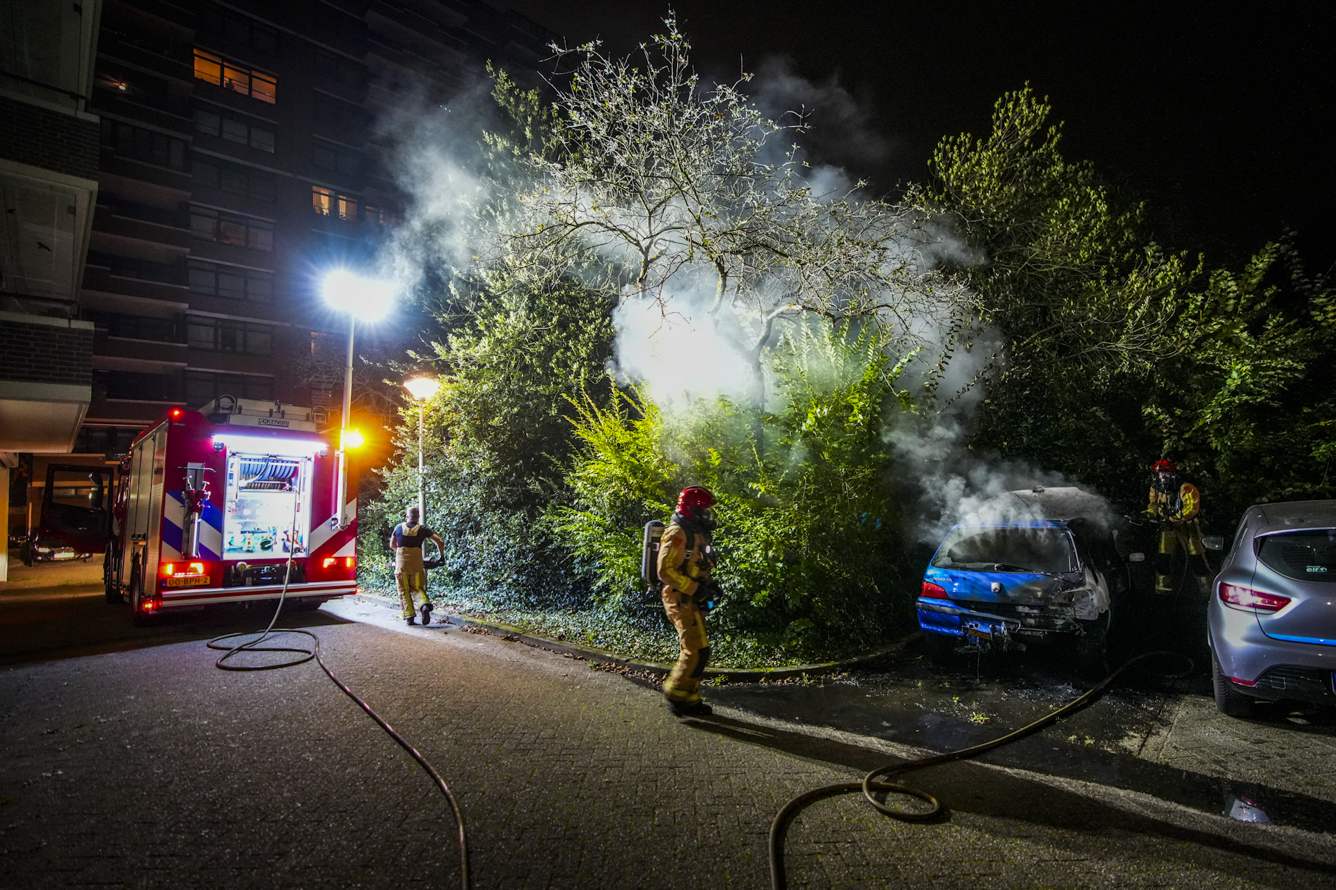 Geplaatst op 7 oktober 2024, om 07:47 uurEINDHOVEN – Voor de vierde nacht op rij is in Eindhoven een auto in vlammen opgegaan, ditmaal op een parkeerplaats achter een flat aan de Hudsonlaan. De brandweer kon het voertuig niet meer redden, maar wist wel te voorkomen dat het vuur oversloeg naar een rij auto’s die op dezelfde parkeerplaats stond. Een auto die direct naast het brandende voertuig geparkeerd stond, liep echter flinke schade op.