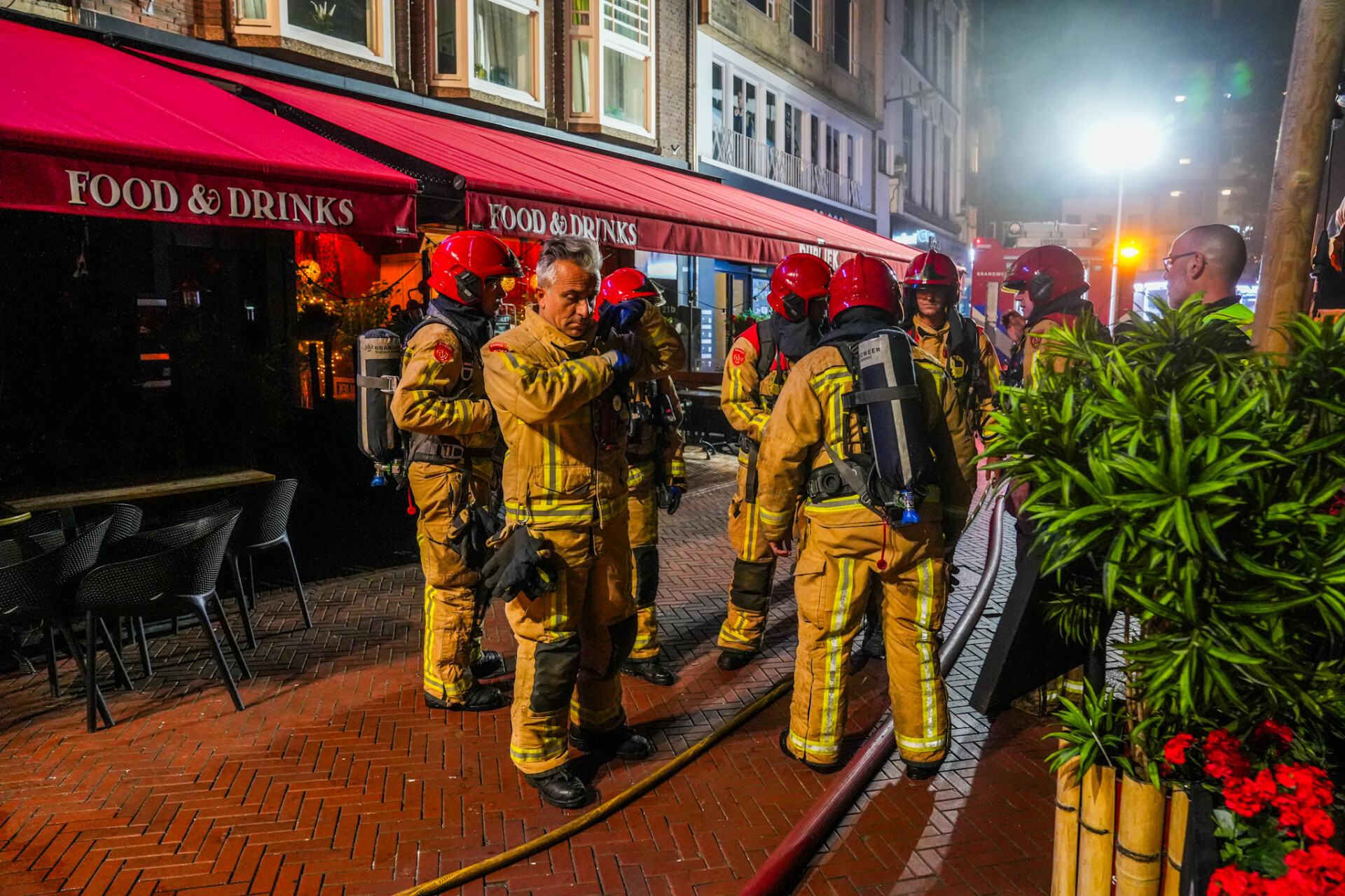 De brandweer had het vuur snel onder controle, ondanks de beperkte bereikbaarheid door de vele terrassen. De omgeving werd afgezet en de politie was aanwezig met meerdere teams. Niemand raakte gewond.
