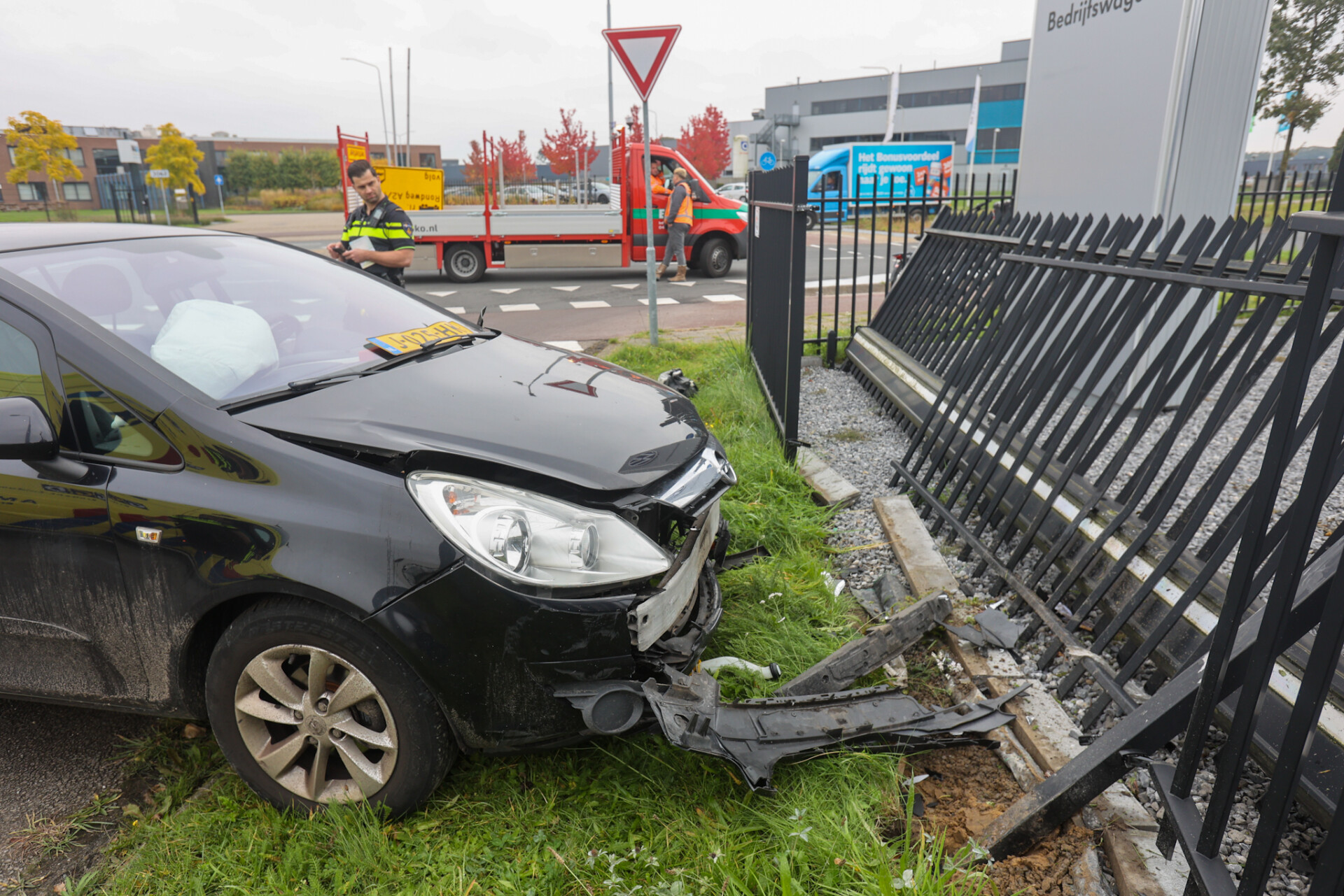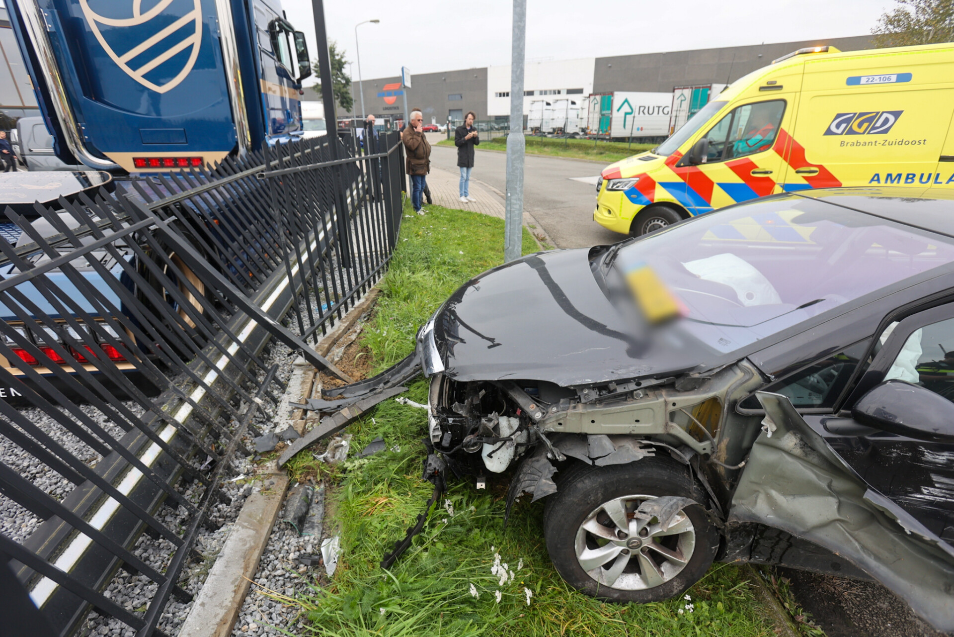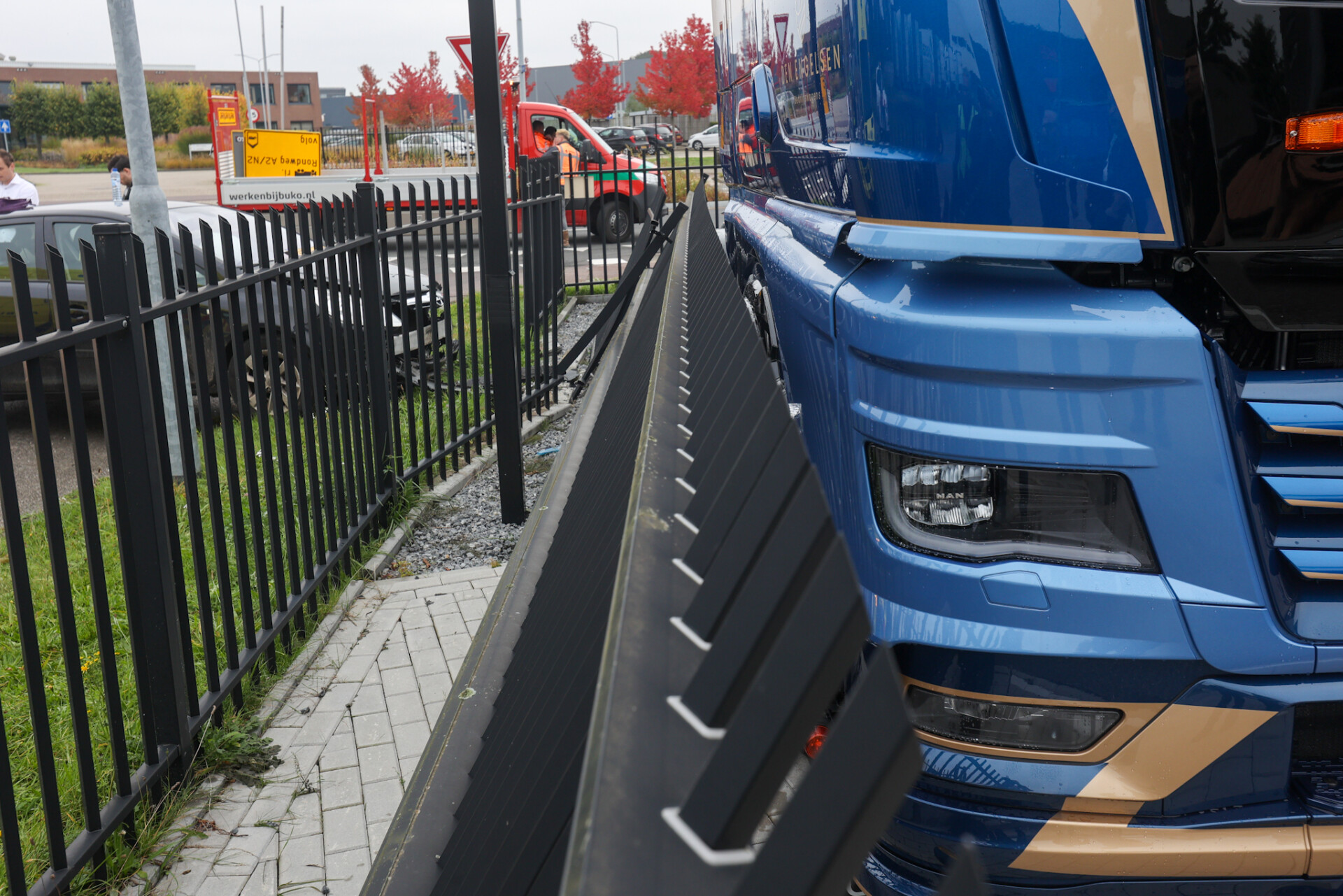 Een afslaande bestelbus kwam in botsing met een auto die rechtdoor reed. Door de klap schoof de auto tegen een hekwerk, dat loskwam en tegen een geparkeerde vrachtwagen terechtkwam, waardoor ook deze schade opliep.