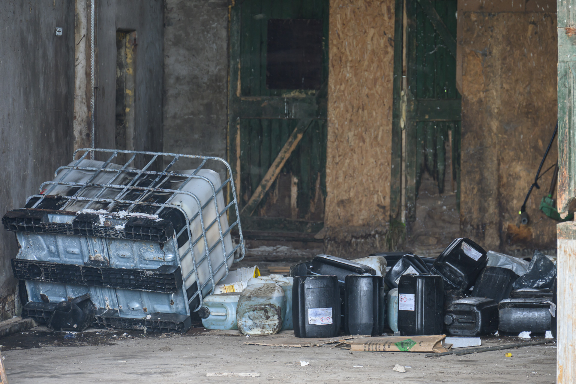 De politie en brandweer vonden in een schuurtje naast het pand tien grote blauwe vaten en tientallen jerrycans, met naar schatting zo’n 700 liter drugsafval.