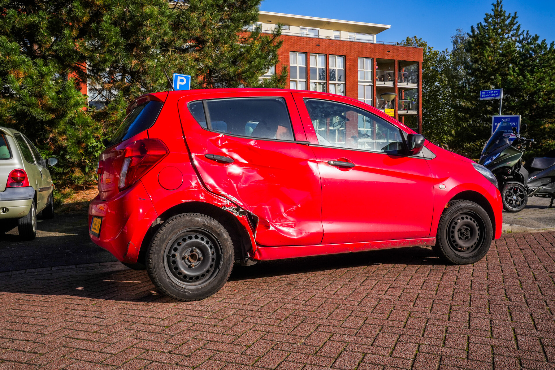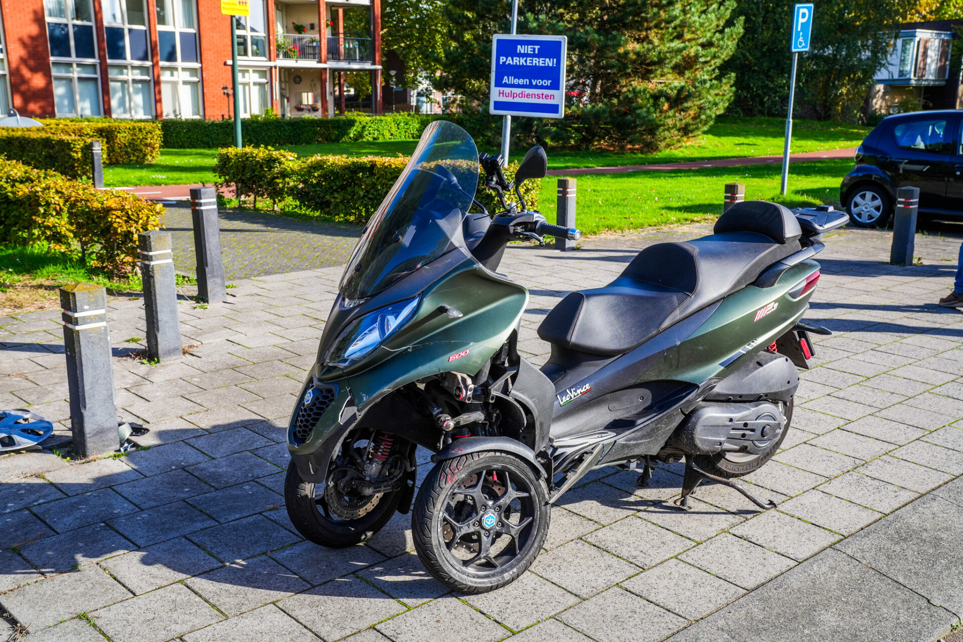 Beide voertuigen liepen schade op: de motor, een driewieler (MP3), raakte aan de voorkant beschadigd, terwijl de auto een deuk en lakschade opliep.